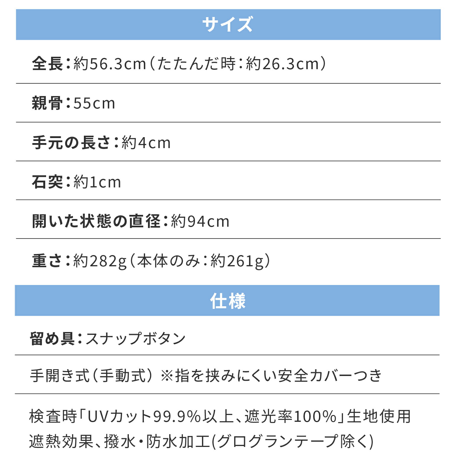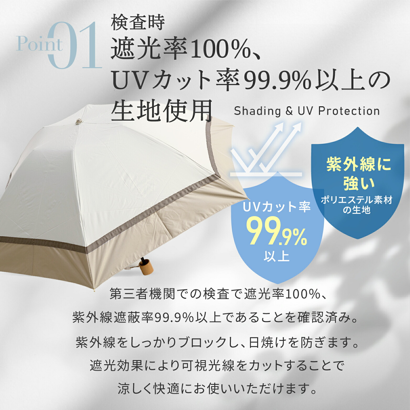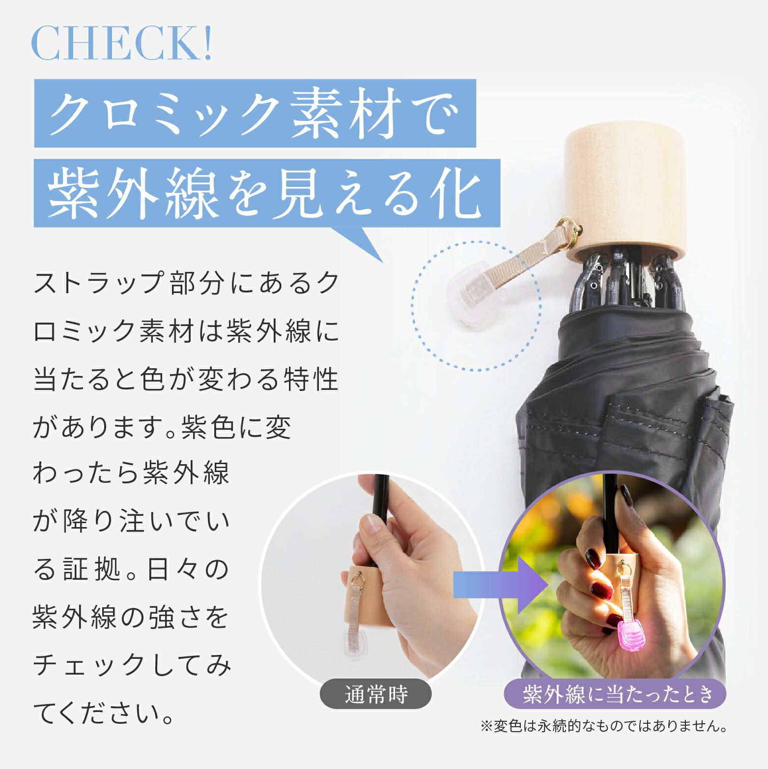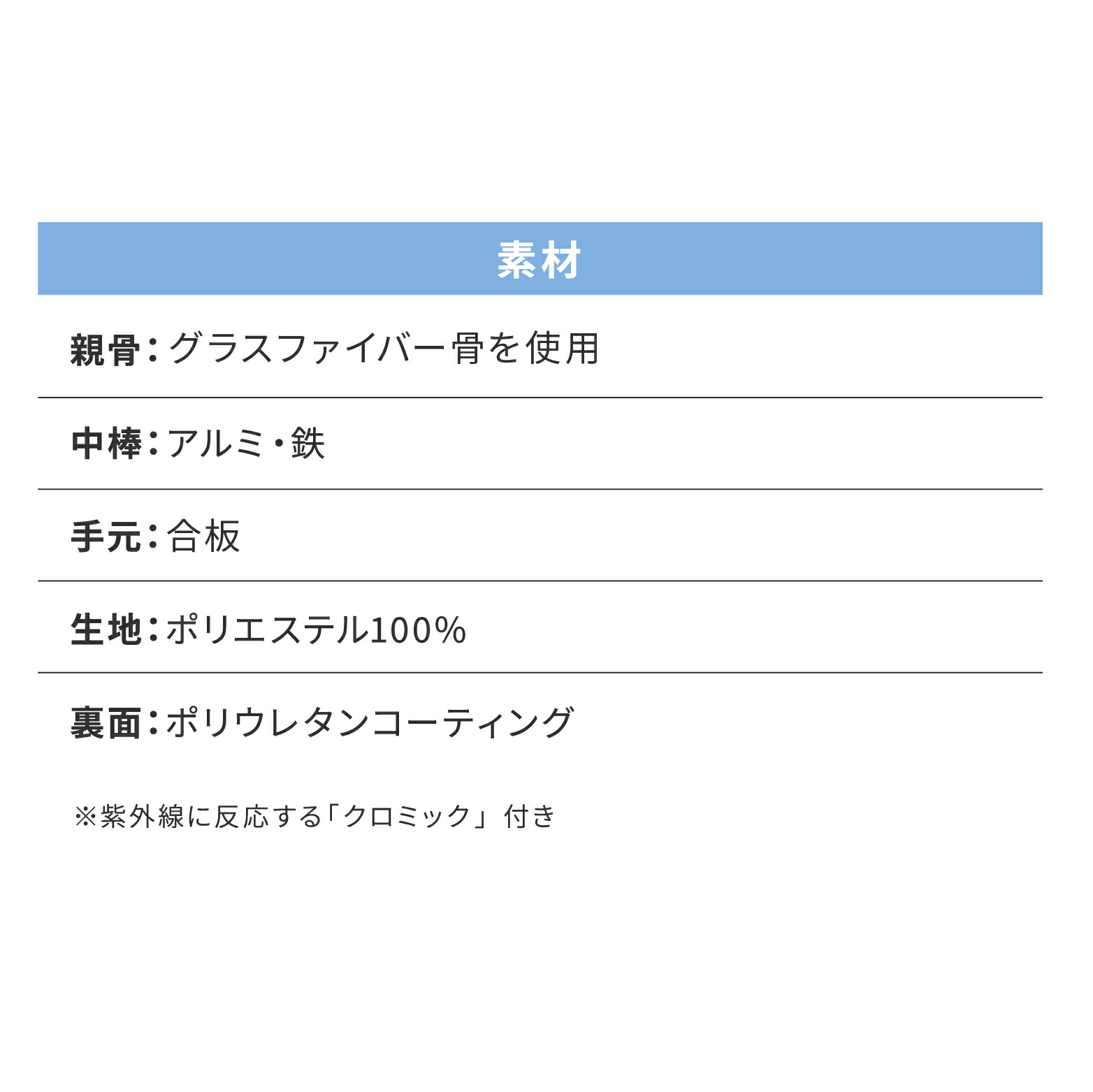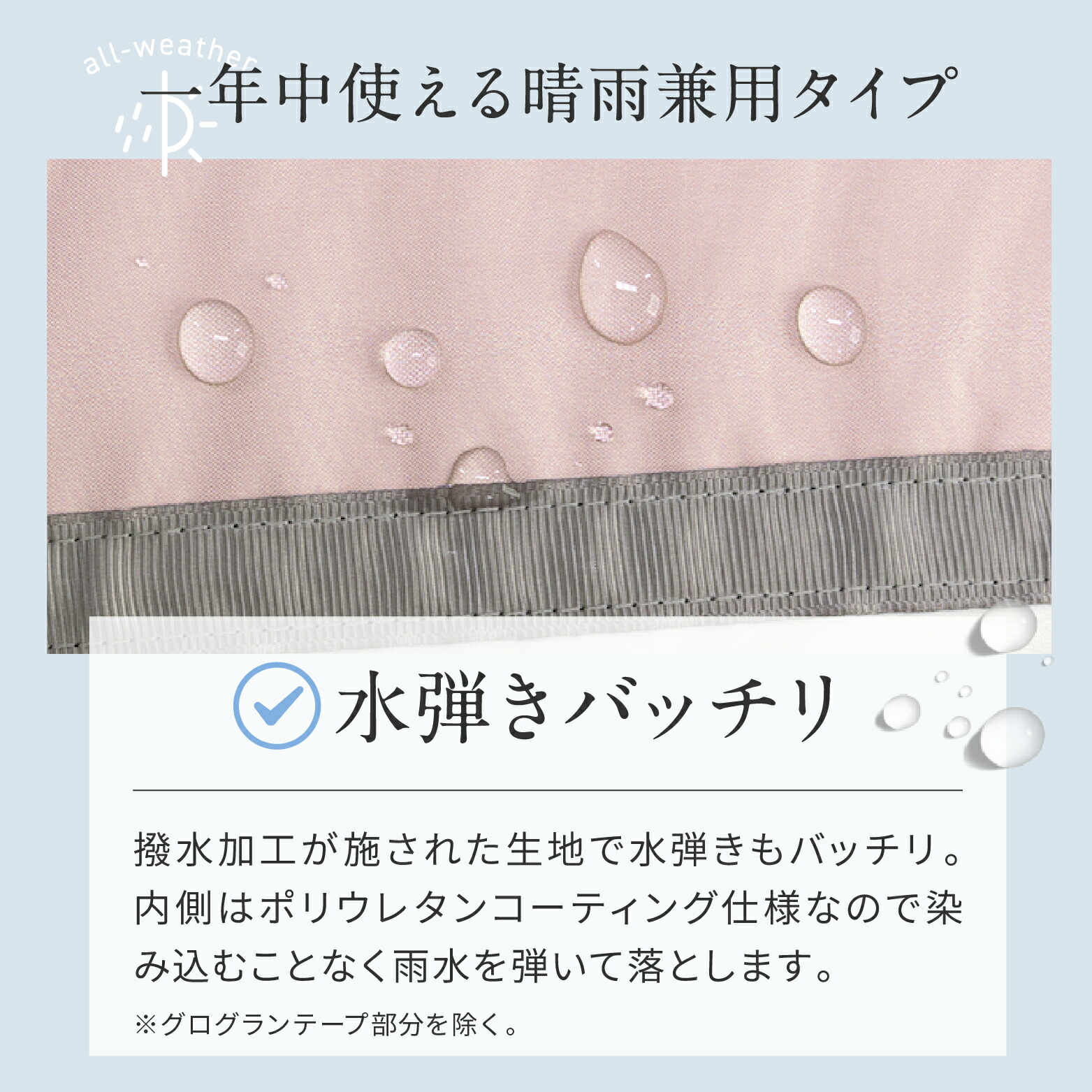 UVカット率99%以上、遮光率100%(完全遮光)、1級遮光、はっ水加工、遮熱効果、UPF50+を備え、紫外線に反応するクロミック素材のチャーム付き。日差しの強い日も安心して使用できます。