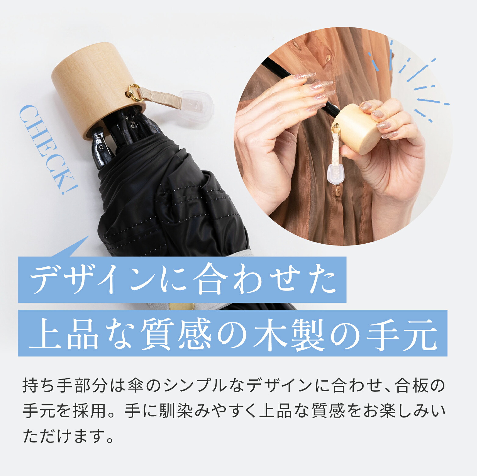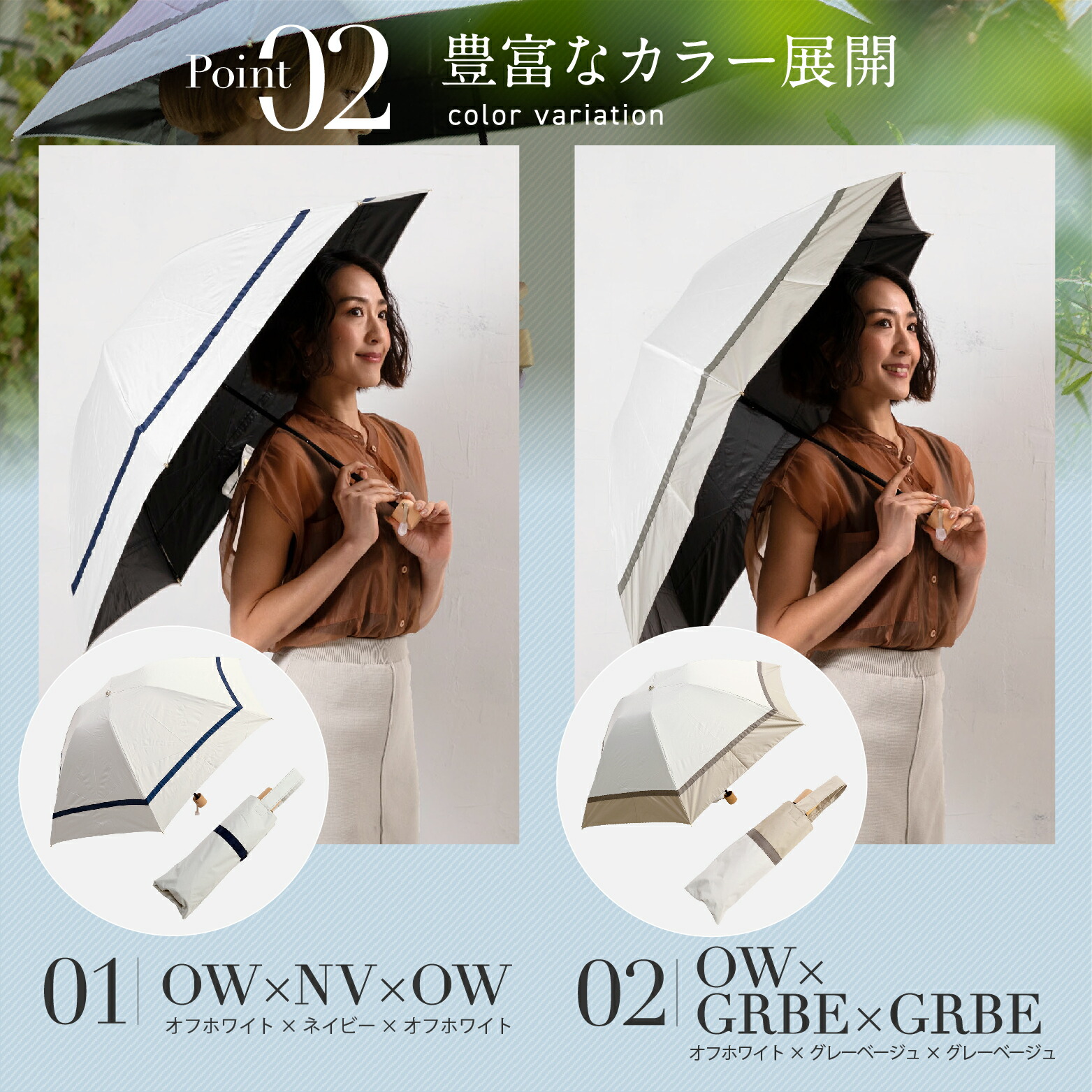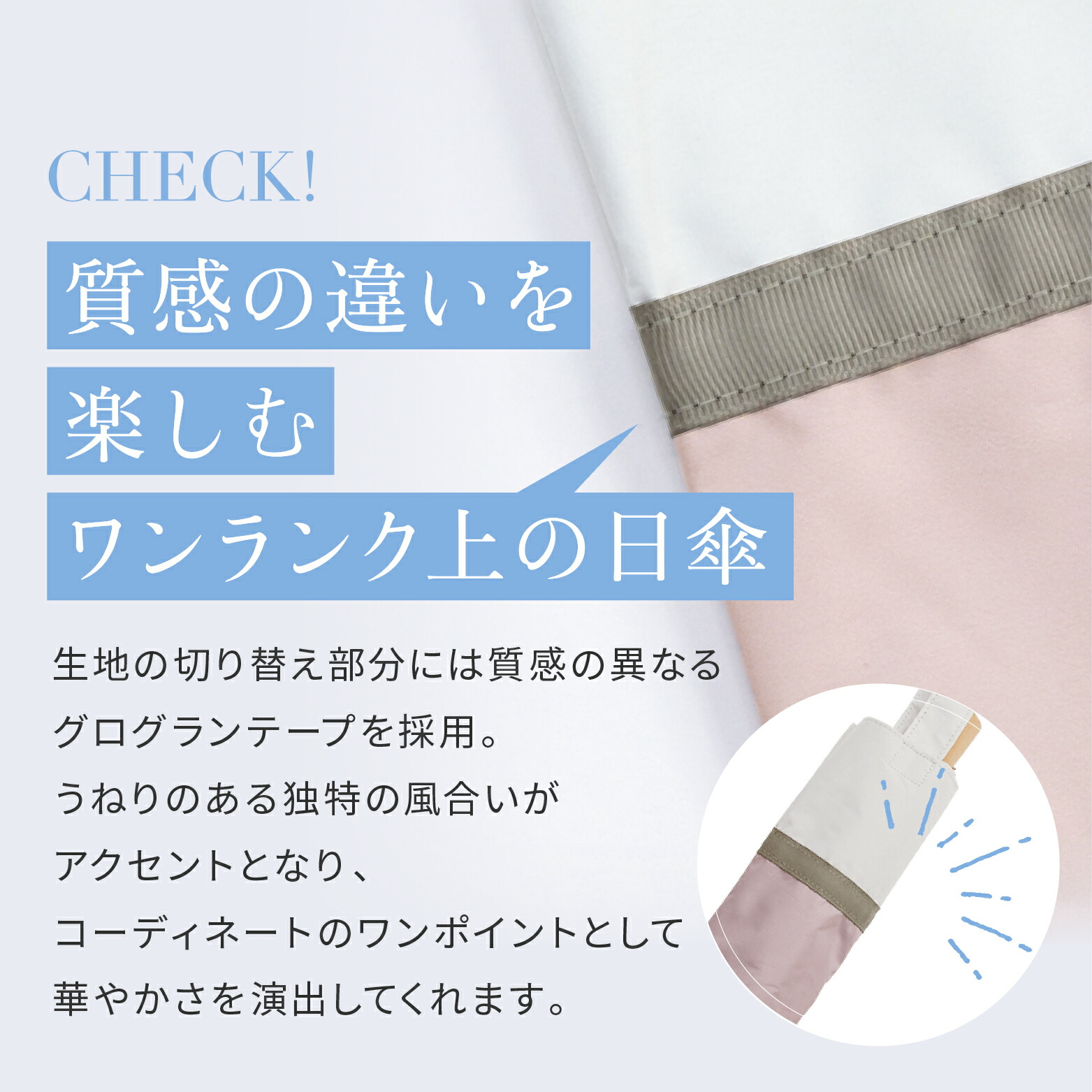 完全遮光、1級遮光の折りたたみ日傘です。日傘デビューの学生さんから小さなお子さまのいるママさん・子育てがひと段落した女性まで、幅広い年代・シーンでお使いいただけるような、上品な無地の切り継ぎデザインになっています。ネームバンドにはうねりのある独特な風合いのグログランテープを使用し、シンプルでありつつ質感の違いを楽しむことができます。