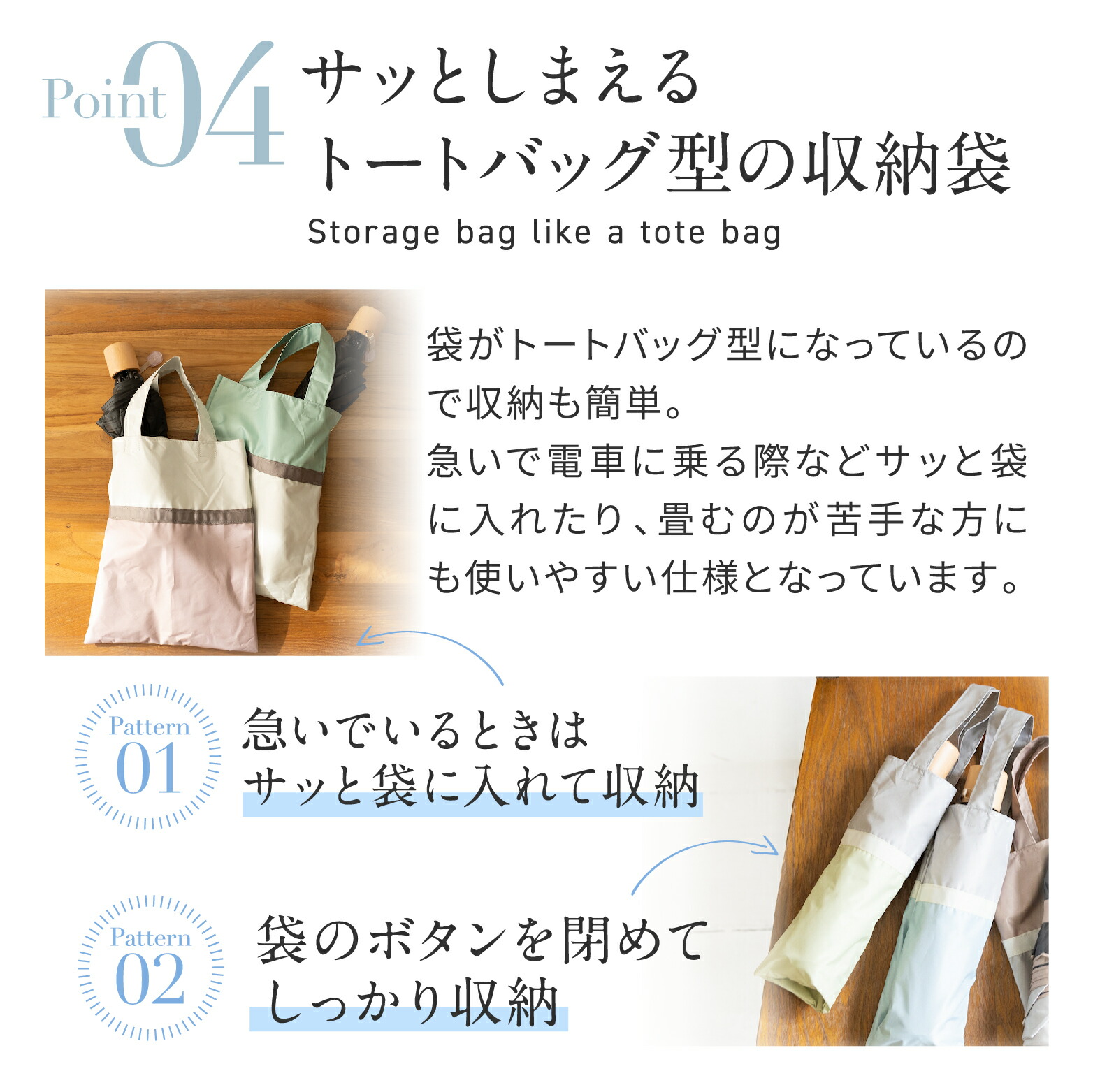親骨は軽量で錆びにくいグラスファイバー製です。さらに、付属の収納袋はトートバッグ型になっていて、傘をキッチリきれいにたたまなくても収納できるため、急いでいる時や車や電車の乗り降りの時にも便利です。紫外線を受けて色が変わるクロミック素材のストラップが付いており、日傘を使うタイミングを教えてくれます。雨でも使える晴雨兼用タイプなので、天気によって傘を入れ替える必要がありません。