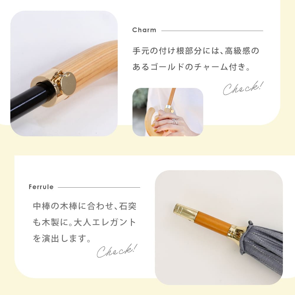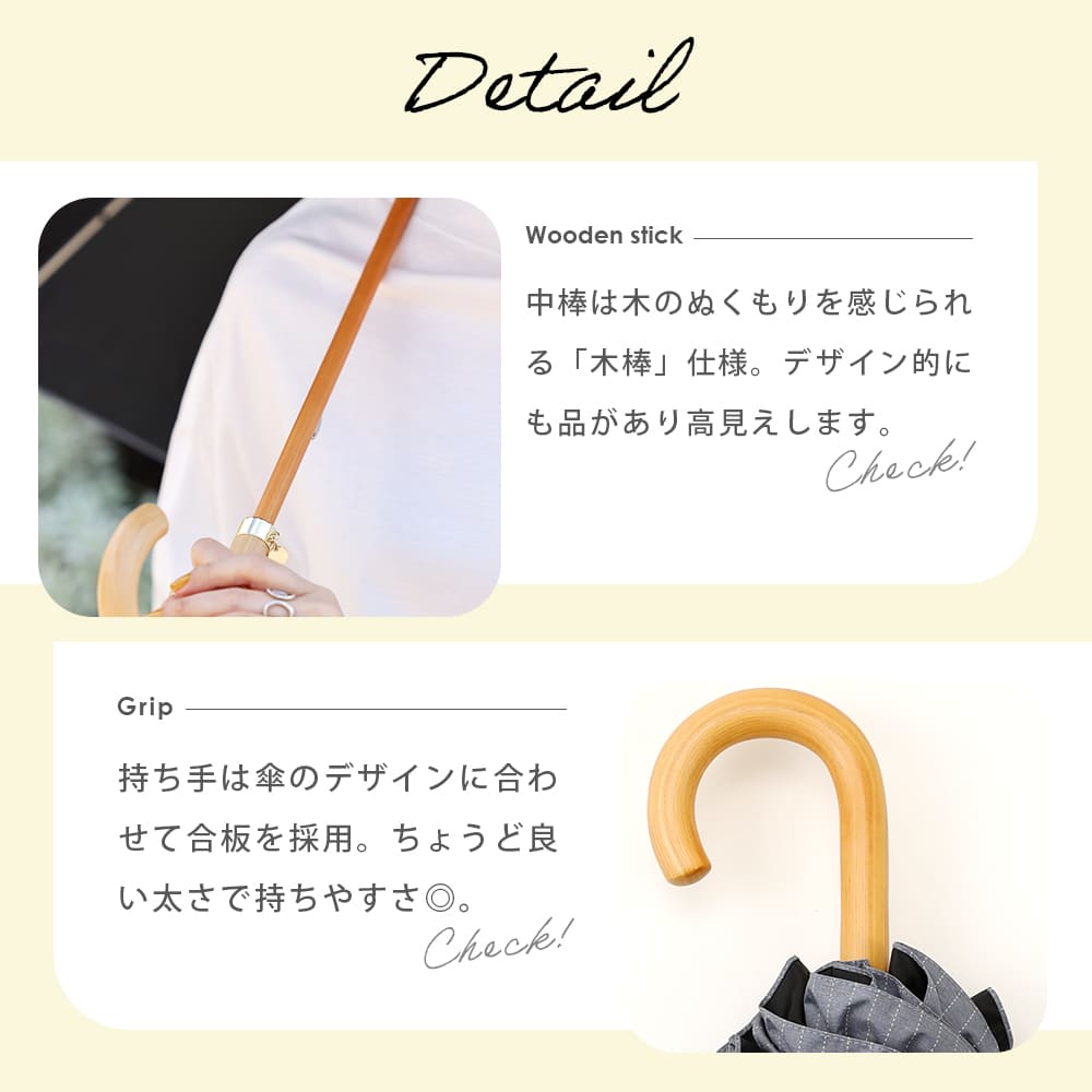 ピンストライプのプリントを施したポリエステル生地を使用。裾や留めバンドにはグログランテープを取り入れ、異素材のさりげない組み合わせがデザインアクセントになっています。木製の中棒や上品なゴールドのチャームが、洗練された印象を演出します。