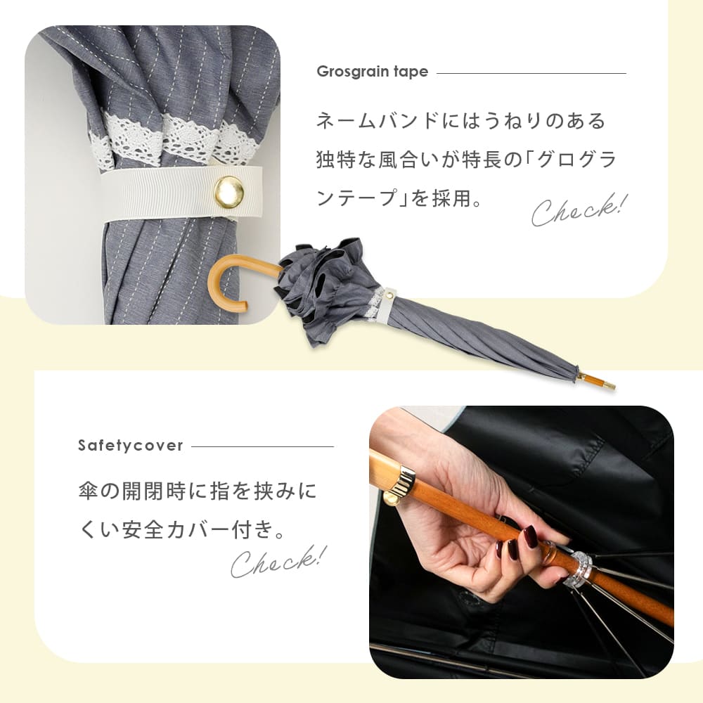 カラーはオフホワイト、ベージュ、ダンガリー調の3色展開。ピンストライプのプリント生地、レースの華やかさ、上品なゴールドのチャーム、グログランテープのアクセントにより、日常使いはもちろん、ギフトやプレゼントとしても喜ばれる日傘です。