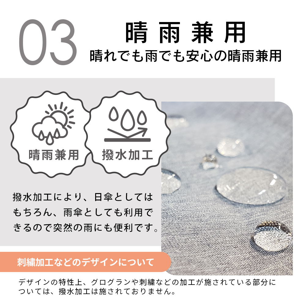 晴雨兼用、UVカット99.9%以上、遮光率100%(完全遮光)、1級遮光、はっ水加工、遮熱効果、UPF50+
