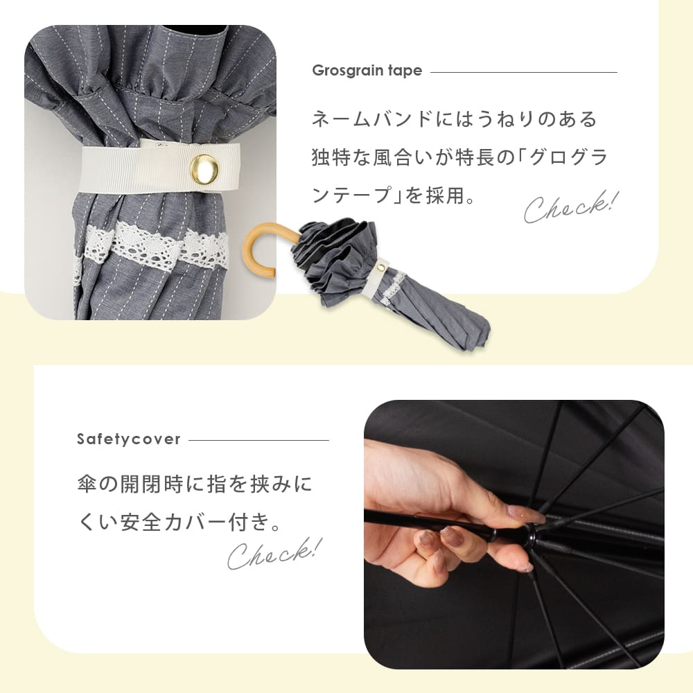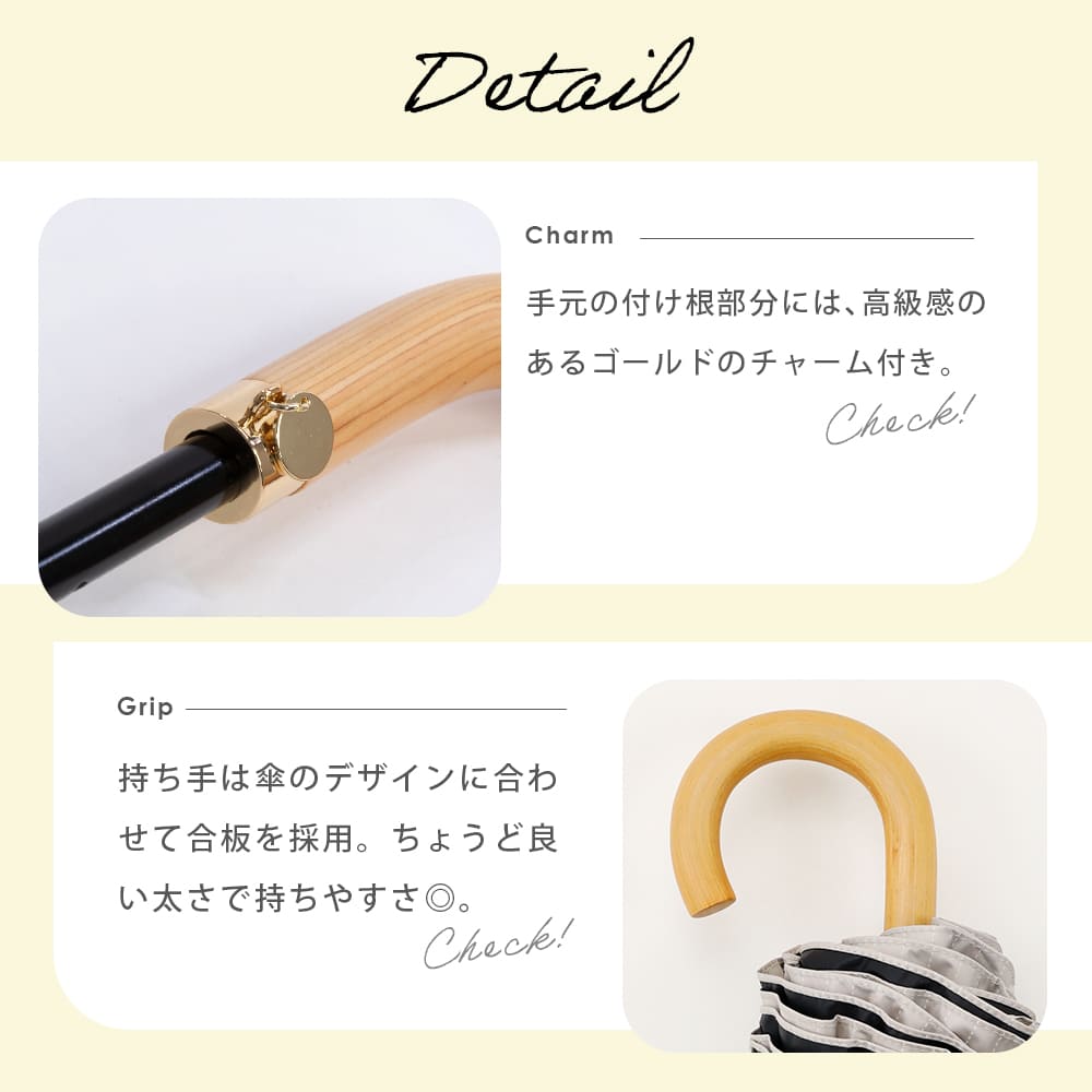 傘の本体には、ピンストライプのプリントを施したポリエステル生地を使用。柔らかく軽やかな手触りと程よいハリ感により、美しいシルエットを保ちながら開閉もスムーズです。裾や留めバンドにはグログランテープを使用し、異素材のさりげない組み合わせがデザインのアクセントになっています。裏面にはポリウレタンコーティングを施し、紫外線99.9%以上カット、完全遮光、撥水加工、遮熱効果、UPF50+などの高機能も備えています。