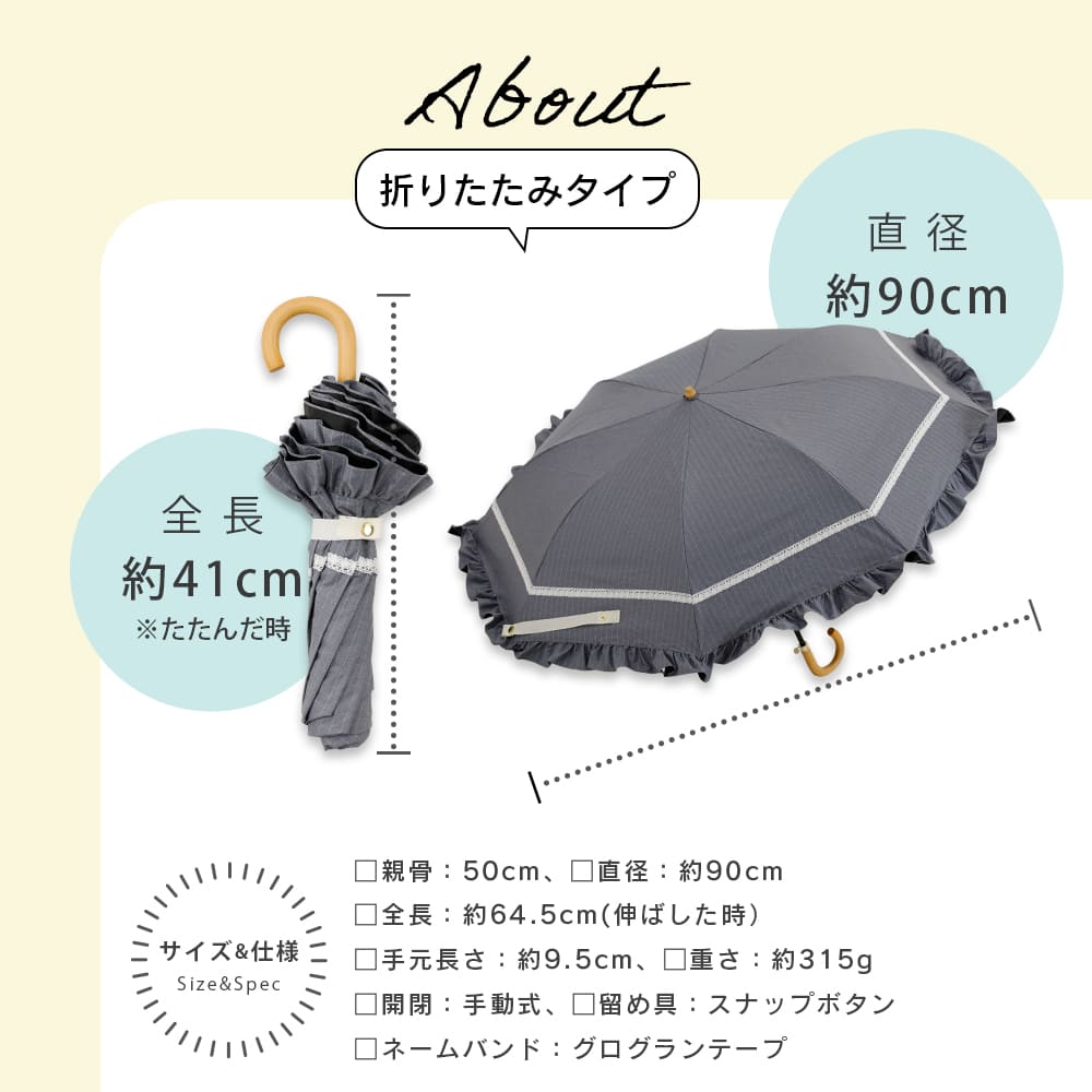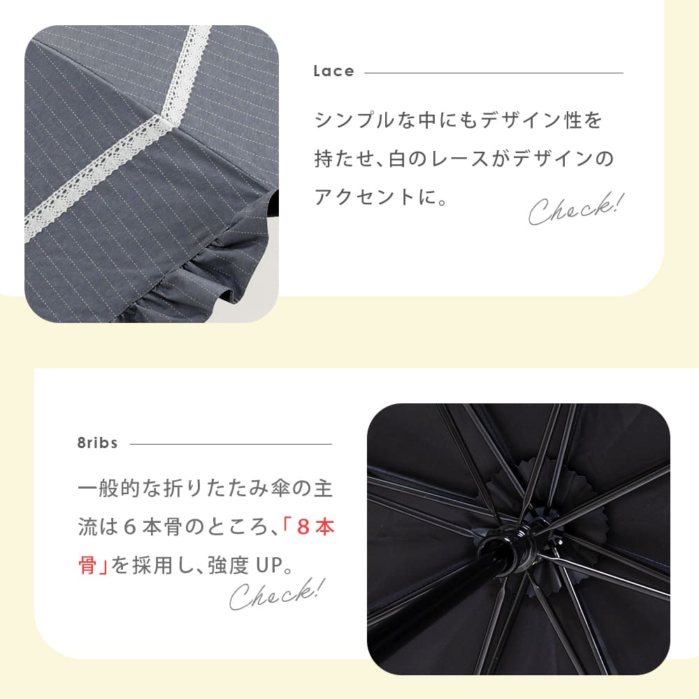 カラーはオフホワイト、ベージュ、ダンガリー調の3色展開。ピンストライプのプリント生地、レースの華やかさ、上品なゴールドパーツ、グログランテープのアクセントにより、日常使いはもちろん、ギフトやプレゼントとしても喜ばれる折りたたみ日傘です。