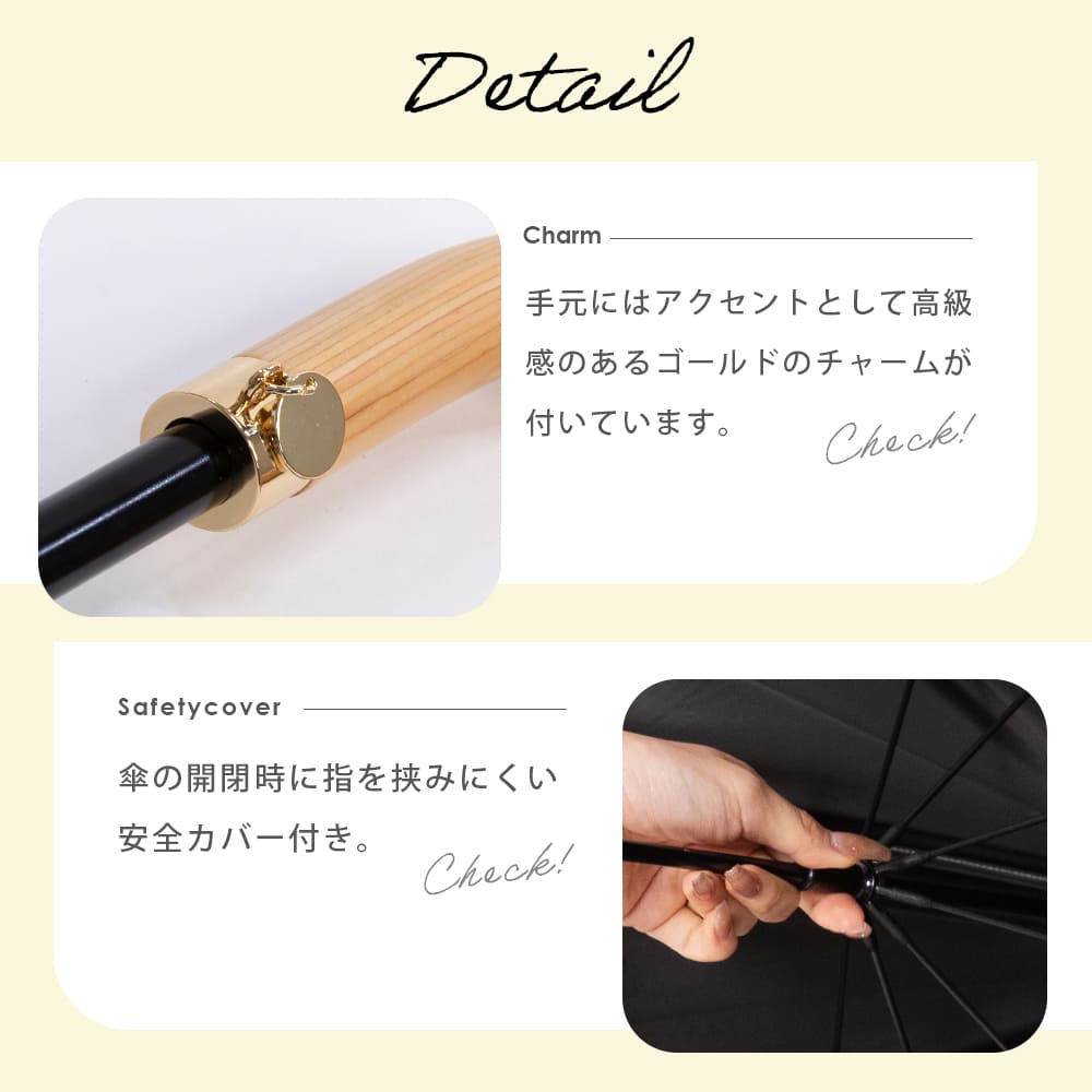 手開き式で開閉がスムーズ。柔らかく軽やかなポリエステル生地を使用し、裏面にはポリウレタンコーティングを施しています。紫外線99.9%以上カット、完全遮光・1級遮光、撥水加工、遮熱効果、UPF50+対応で、晴れの日も雨の日も快適に使用できます。
