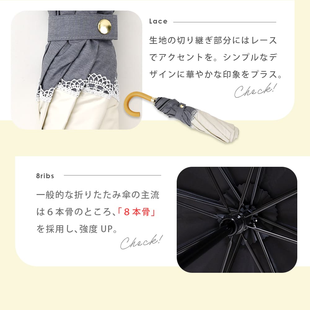 上品なバイカラーの切り継ぎデザインが特徴の2段ミニ折りたたみ傘です。切り継ぎ部分には繊細なレースがあしらわれ、シンプルでありながら華やかさを添えています。手元や留め具にはゴールドパーツをあしらい、持つたびに上品さを感じられる仕様です。コンパクト設計でバッグに収納しやすく、持ち運びに便利です。