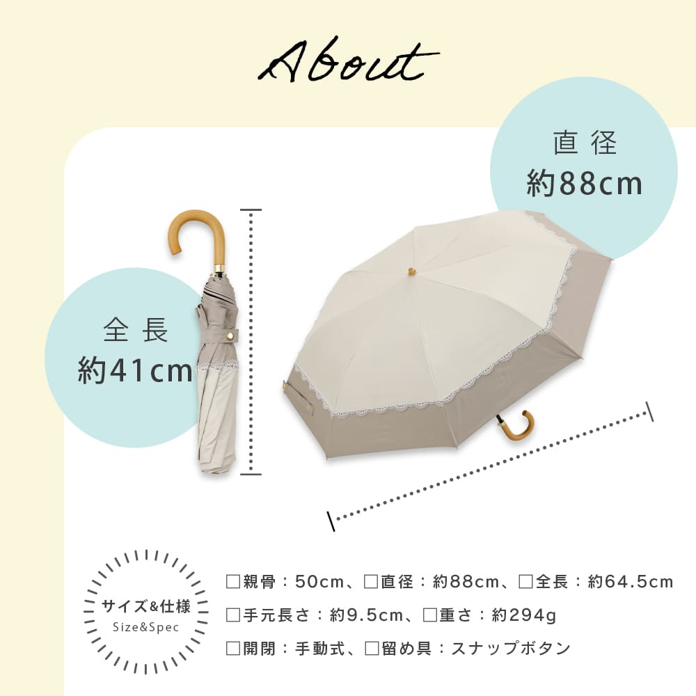 2段折りたたみ仕様により、コンパクトに折りたたんでバッグに収納可能。開閉は手開き式で、日常使いの外出もスムーズに対応できます。傘の本体は柔らかく軽やかなポリエステル生地を使用し、裏面にはポリウレタンコーティングを施しており、紫外線99.9%以上カット、完全遮光、撥水加工、遮熱効果、UPF50+といった高機能仕様を備えています。晴れの日も雨の日も、日差しや雨からしっかり守られ、快適に過ごせます。