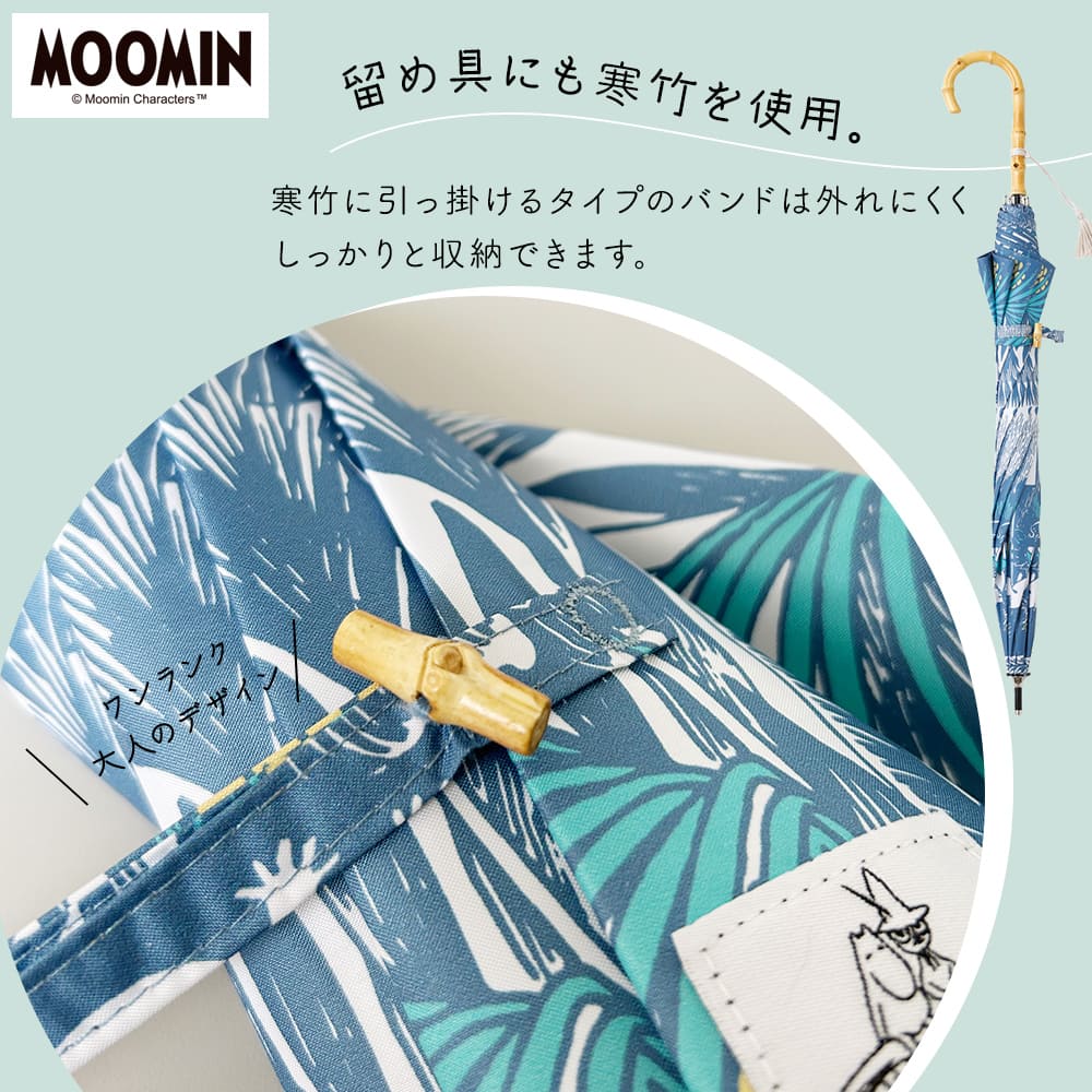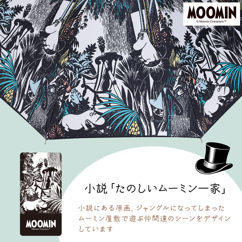 ムーミン原作小説『たのしいムーミン一家』から、ジャングルのようになったムーミン屋敷で遊ぶ仲間たちの一場面を切り取ったデザインの晴雨兼用長傘です。
