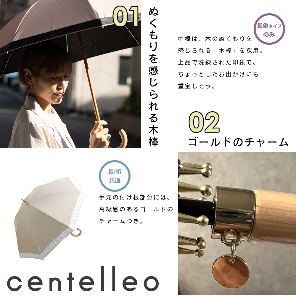 centelleo(センテリオ)の晴雨兼用日傘は、上質な木製の中棒と石突、手元にゴールドチャームをあしらった木庭手元を採用した、洗練されたデザインの長傘です。傘の裾と留めバンドには太めのグログランテープを使用し、異素材の組み合わせがさりげないアクセントとなっています。
