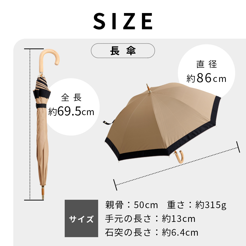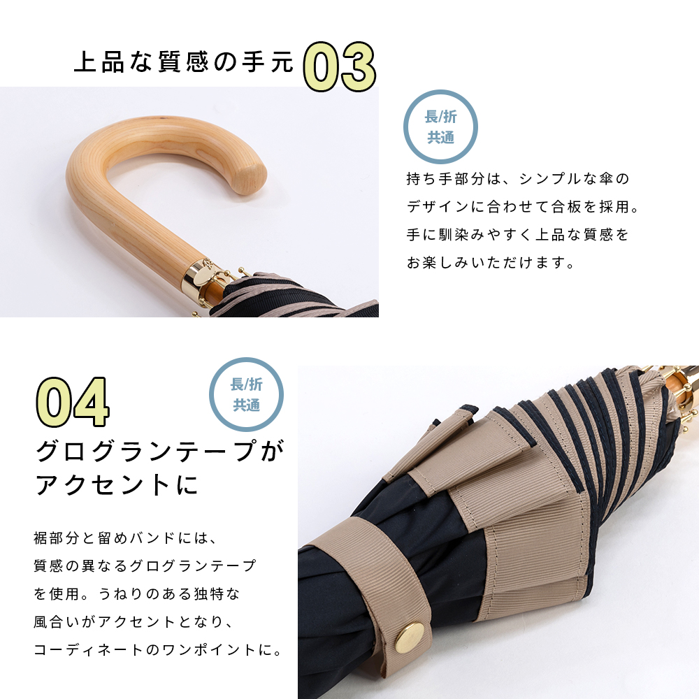 幅広のグログランテープを縁取りに施し、異素材の組み合わせが楽しめる日傘です。晴雨兼用で日差しをしっかりガードし、急な雨にも対応できる機能性を備えています。シンプルで上品なデザインは、日常使いにぴったりです。