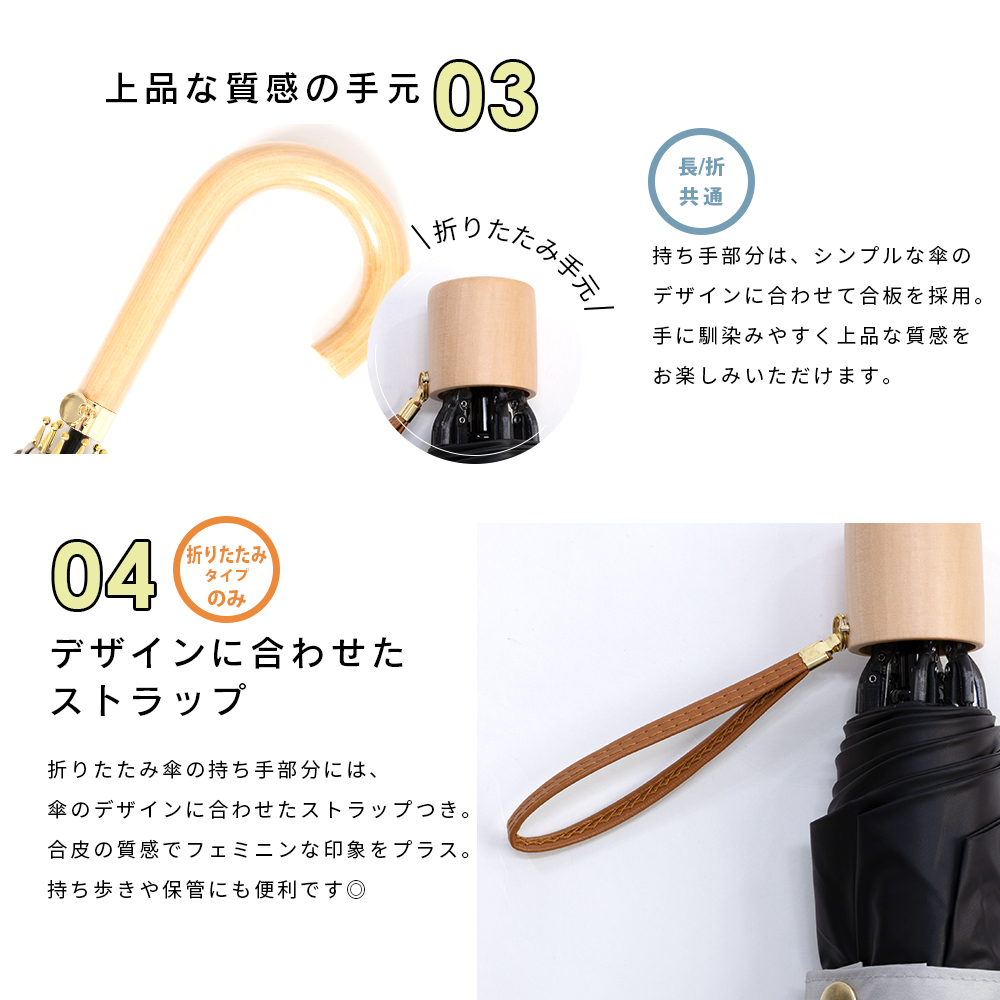 完全遮光でUVカット率・遮光率99%以上を実現。撥水加工が施されており、晴れの日も雨の日も安心して使用できます。軽量でコンパクトなデザインは、持ち運びにも便利です。また、中棒に高級感のある木製素材を使用しており、手にしたときの質感も上品です。