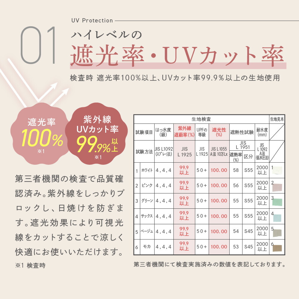 晴雨兼用、UVカット99%以上、遮光率100%(完全遮光)、1級遮光、はっ水加工、遮熱効果、UPF50+