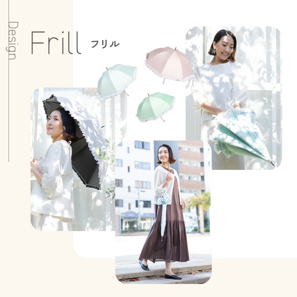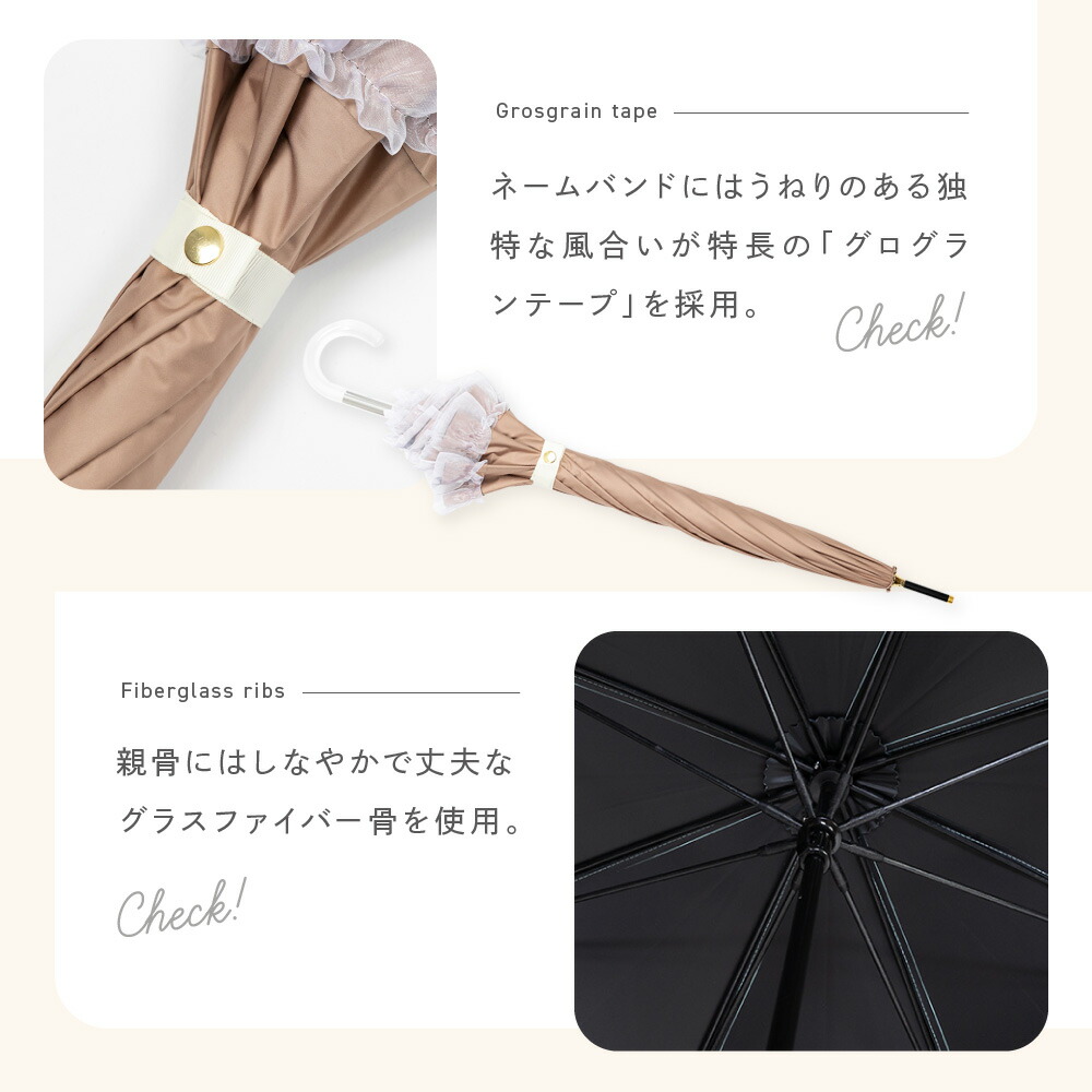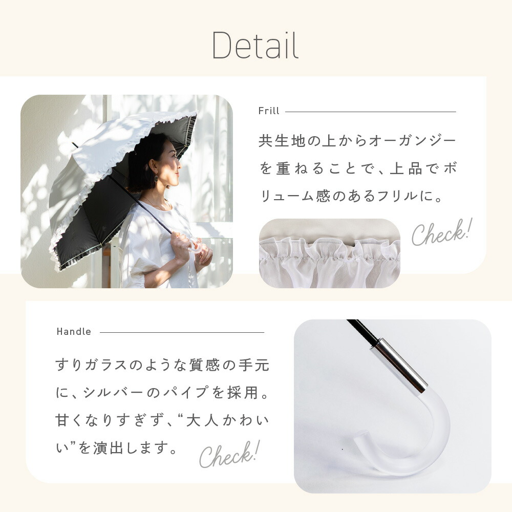 共生地とオーガンジー生地の二重使いにより上品かつボリューム感のあるフリルに仕上がっています。また、うねりのある独特な風合いのグログランテープのネームバンドが特徴になっています。さらに、すりガラスのような質感の手元にメタリックなパーツをプラスすることで、甘くなりすぎない「大人カワイイ」を演出します。日傘デビューの学生さんから小さなお子さまのいるママさん・子育てがひと段落した女性まで、幅広い年代・シーンでお使いいただけます。