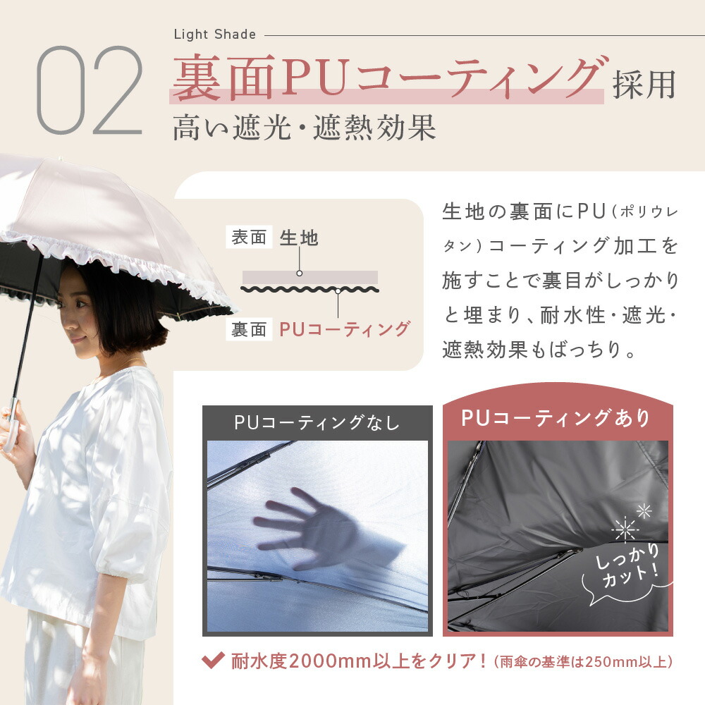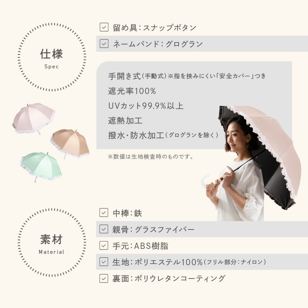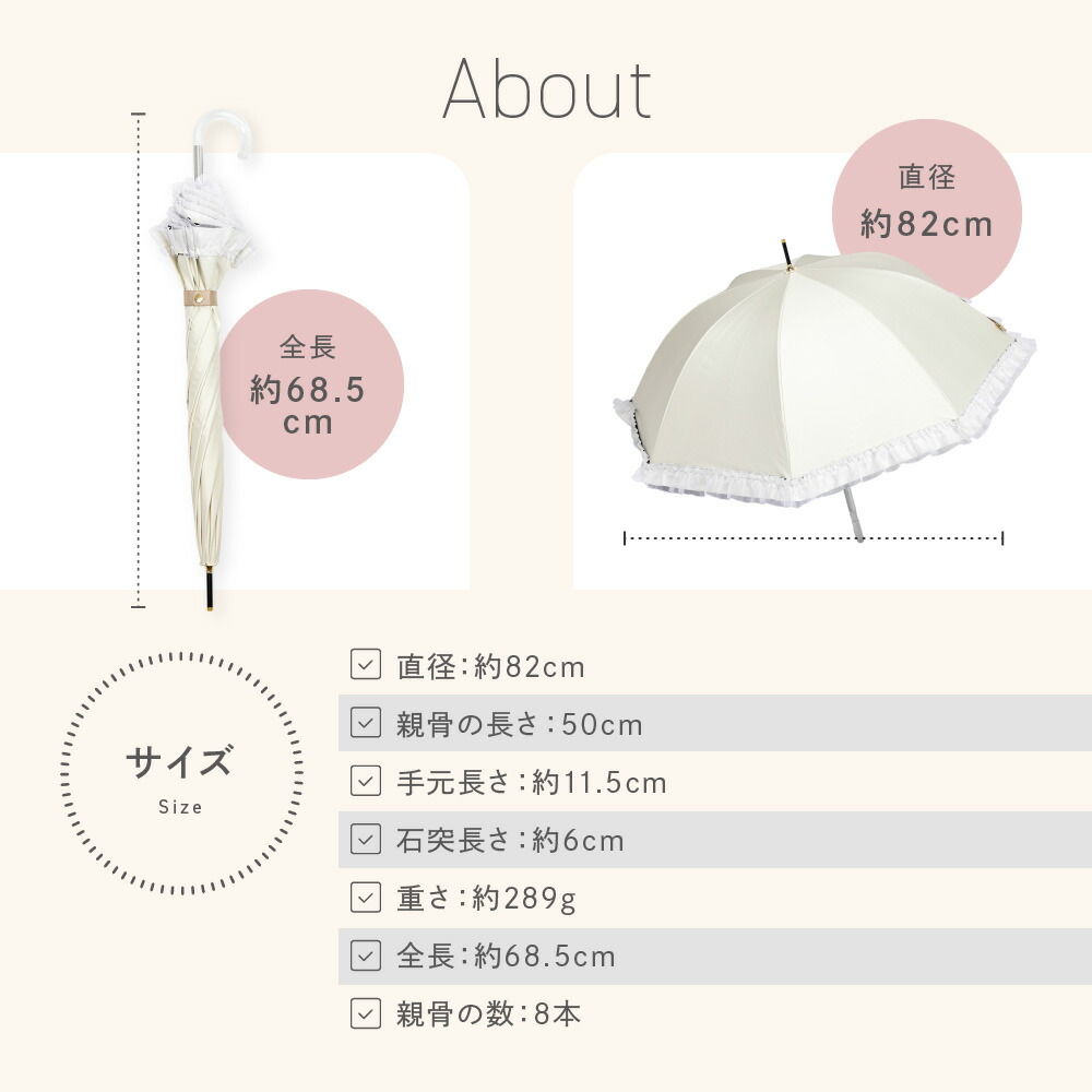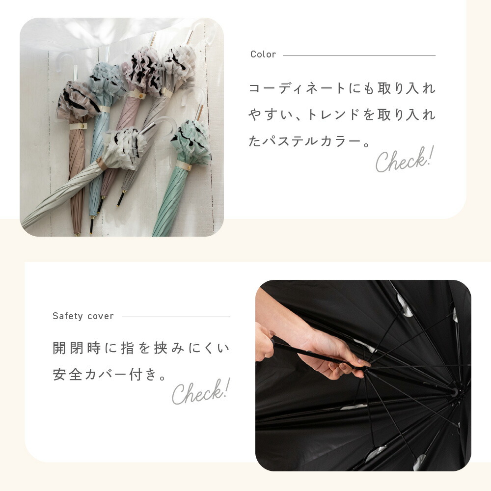 共生地とオーガンジー生地の二重使いにより上品かつボリューム感のあるフリルに仕上がっています。また、うねりのある独特な風合いのグログランテープのネームバンドが特徴になっています。さらに、すりガラスのような質感の手元にメタリックなパーツをプラスすることで、甘くなりすぎない「大人カワイイ」を演出します。日傘デビューの学生さんから小さなお子さまのいるママさん・子育てがひと段落した女性まで、幅広い年代・シーンでお使いいただけます。