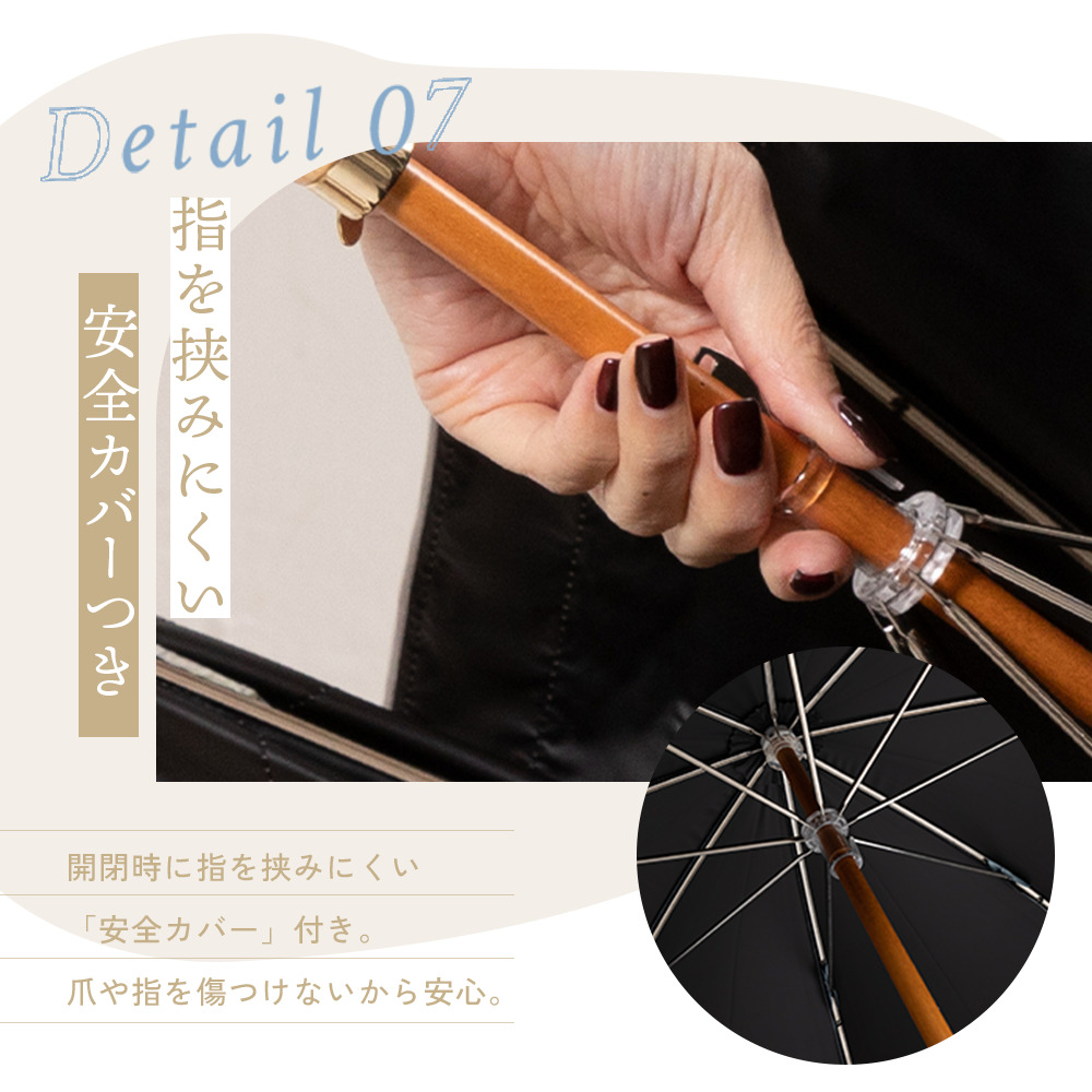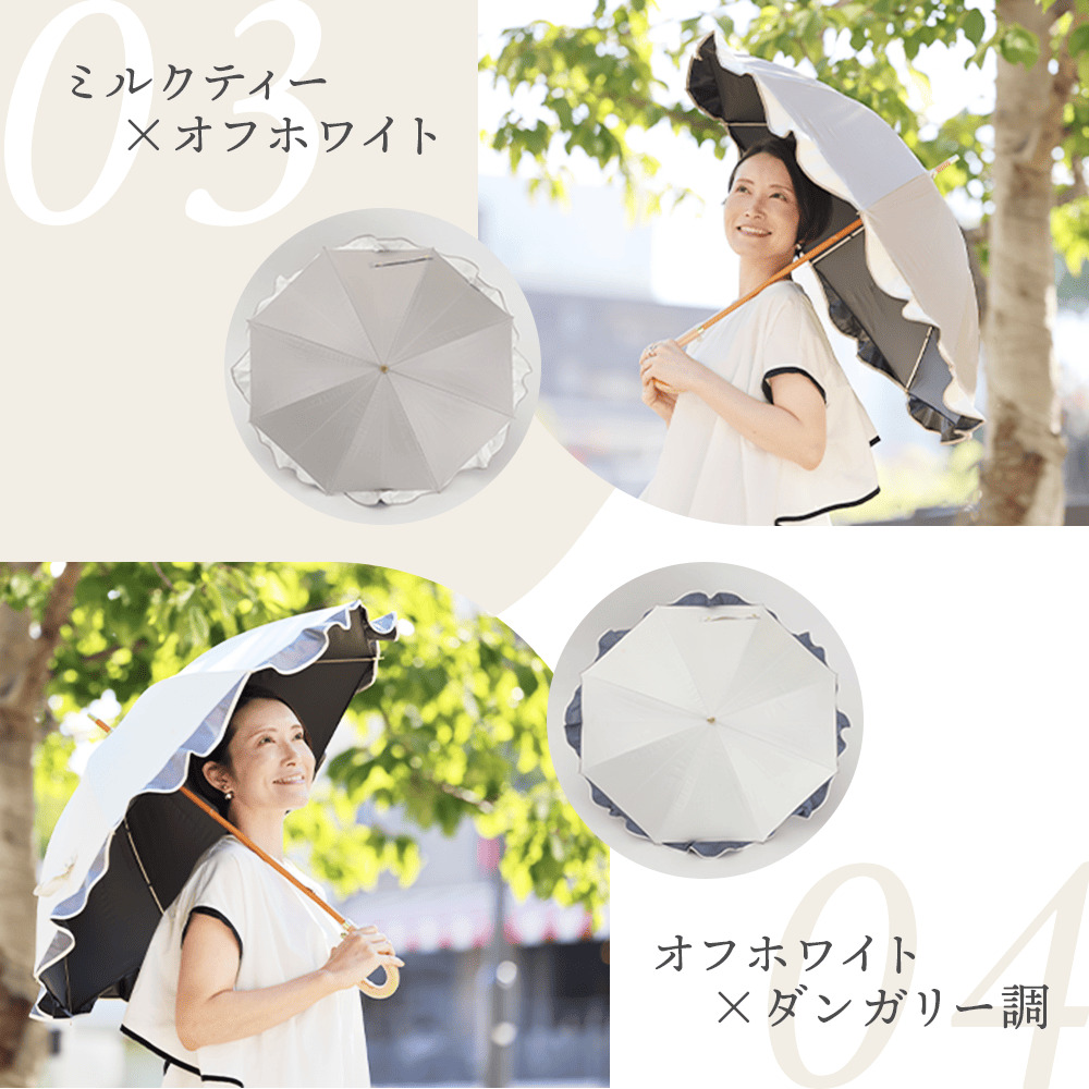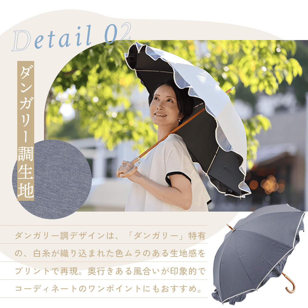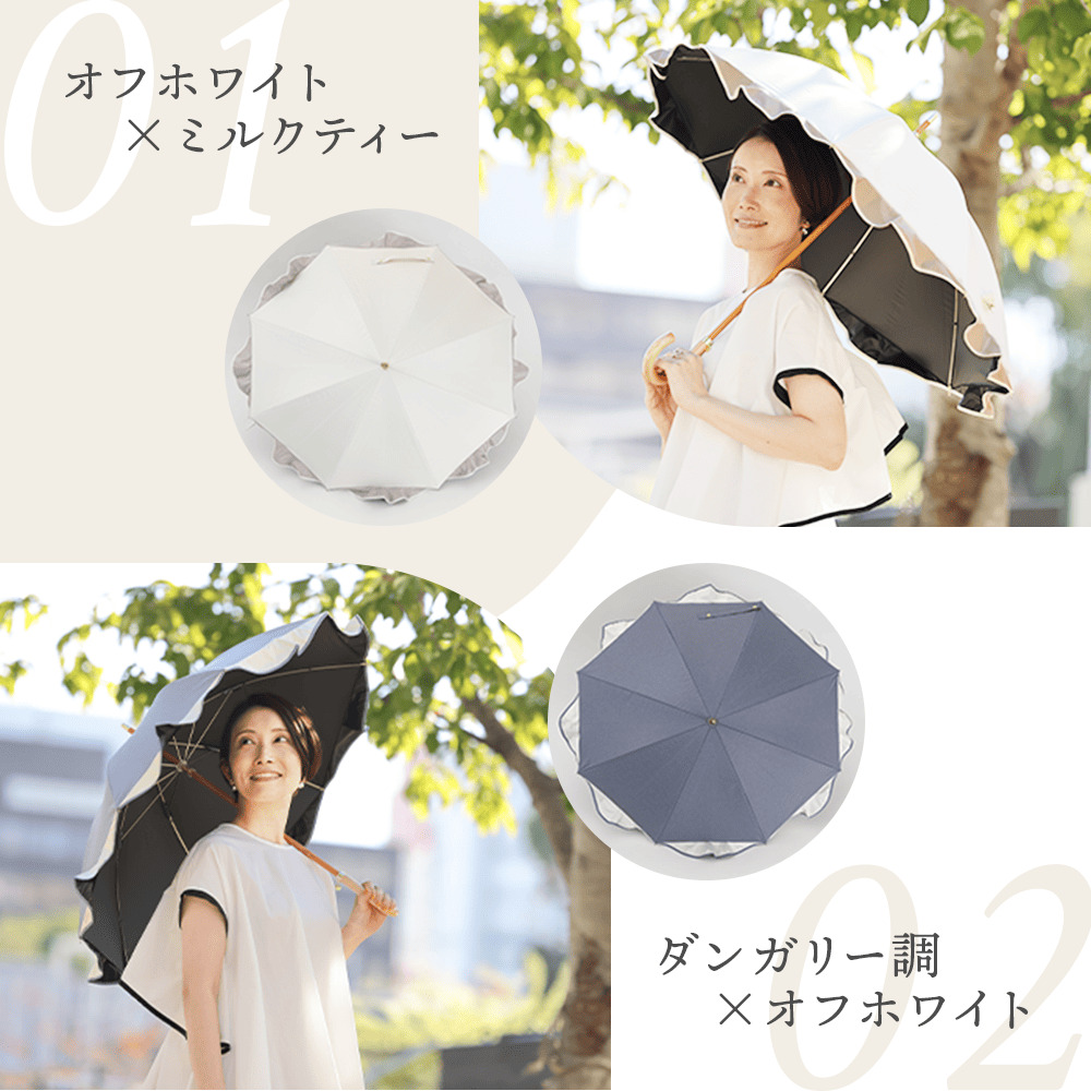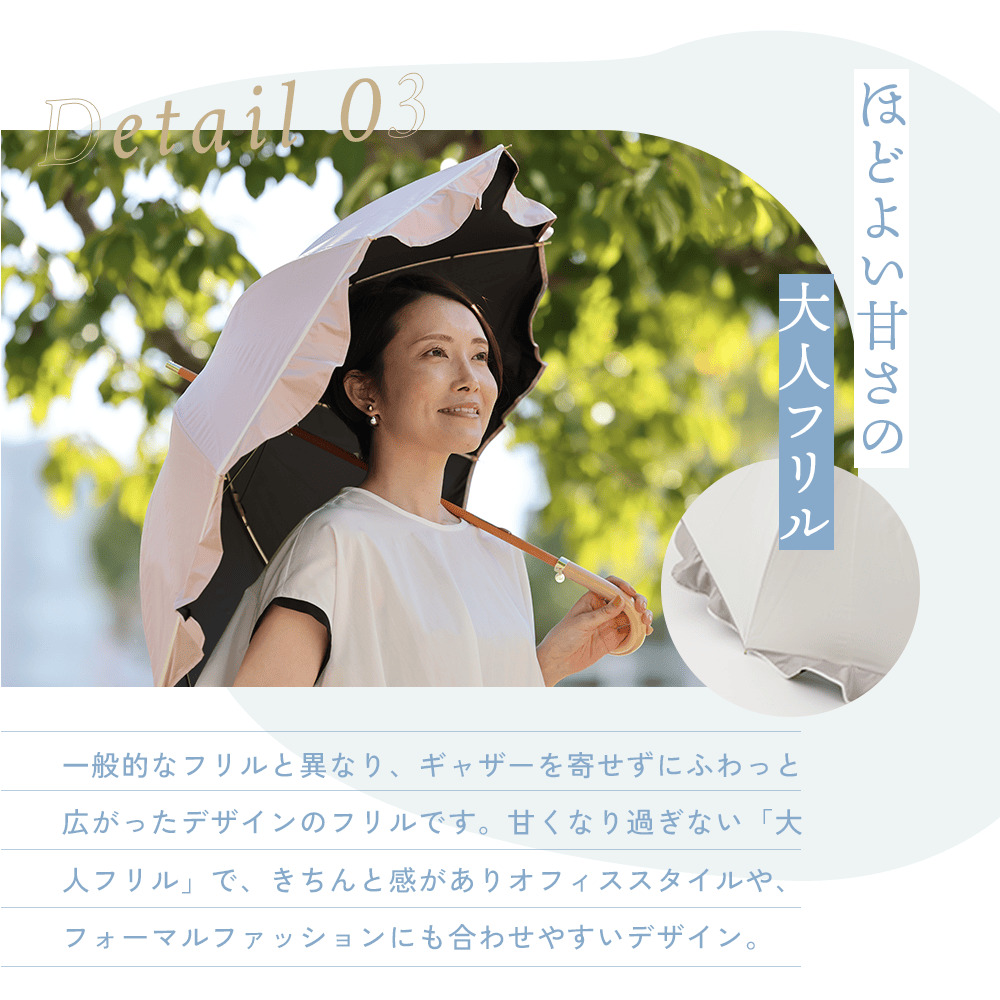 ギャザーを寄せずふんわりと広がるペプラムフリルは、甘くなりすぎず上品な華やかさを演出。傘本体と同素材で丁寧に仕上げられたフリルが、見た目にも上質感を与えます。