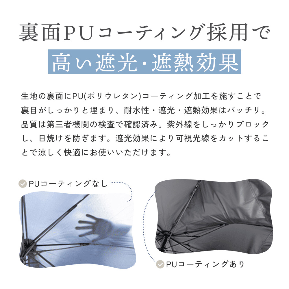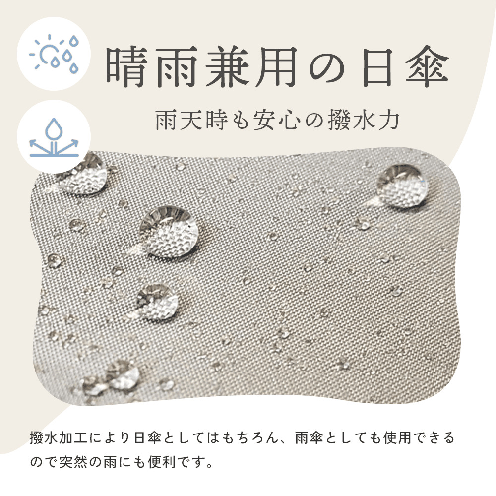 晴雨兼用仕様で、UVカット率99%以上・遮光率100%(完全遮光・1級遮光)を実現。さらに、はっ水加工・遮熱効果・UPF50+の機能を備え、日差し・雨・暑さにも強い一本です。:contentReference[oaicite:0]{index=0}