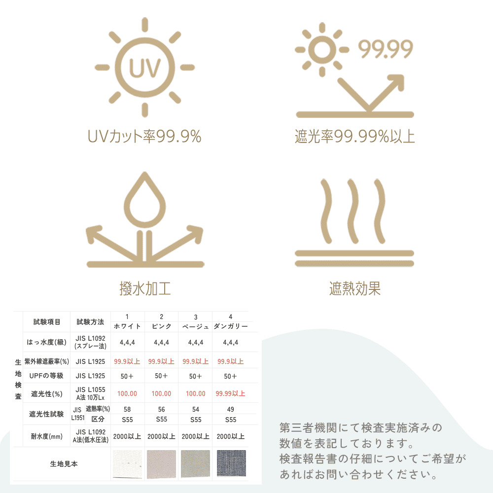 晴雨兼用、UVカット99%以上、遮光率100%(完全遮光)※ダンガリー調は99.99%以上、1級遮光、はっ水加工、遮熱効果、UPF50+