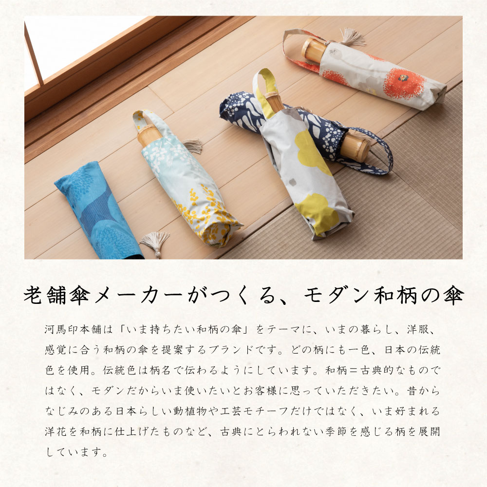 「カバ印の傘カバー」から始まり80年。会社設立から一貫して傘を製造してきた傘の小川が、今までもこれからも愛され続いていくような伝統と現代を繋ぐ和柄の傘を作りました。伝統的な和柄を参考に現代的にアレンジし描き起こしたもの、伝統的な染めの雰囲気をプリントで再現したもの、シンプルでモダンに見える和柄など、和装はもちろん洋服にも合わせやすい柄をラインナップ。さらにすべてのデザインに日本の伝統色が1色用いられています。