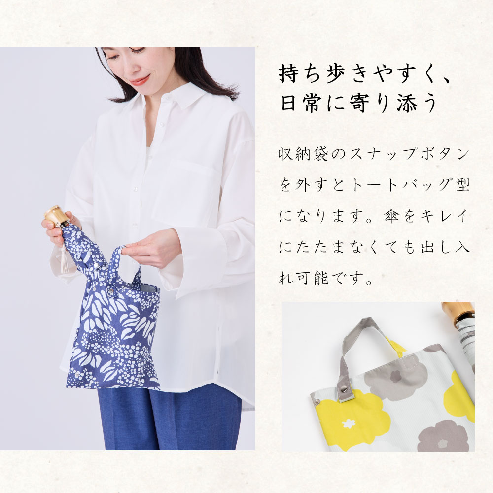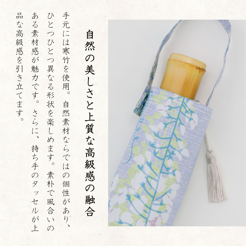急な雨にも対応可能な晴雨兼用日傘です。ポリエステル80%・綿20%の風合いのある生地を使用しています。寒竹の手元にタッセルが付いており、上品な和のテイストが感じられます。骨をポキポキ折らず、スムーズに開閉できます。ボタンを外すとミニバッグになる収納袋が付属しています。