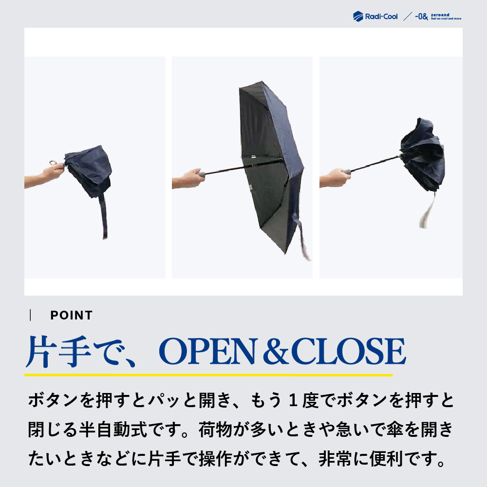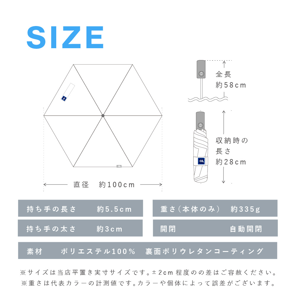 自動開閉式で荷物が多い日でもスムーズに使用可能。晴雨兼用仕様で、日差し対策にも急な雨にも対応します。約290g(収納袋除く)の扱いやすい重さで、毎日の持ち歩きにも便利です。