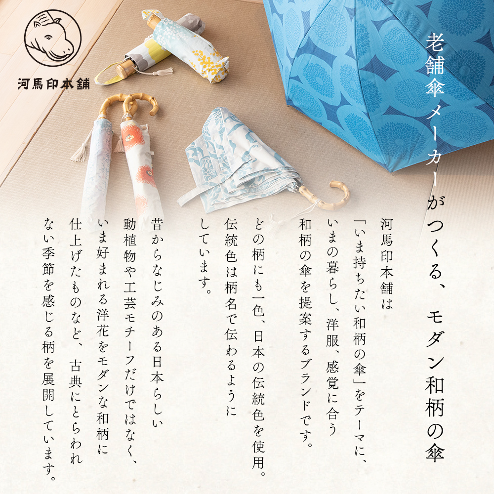 「カバ印の傘カバー」から始まり80年。会社設立から一貫して傘を製造してきた傘の小川が、今までもこれからも愛され続いていくような伝統と現代を繋ぐ和柄の傘を作りました。伝統的な和柄を参考に現代的にアレンジし描き起こしたもの、伝統的な染めの雰囲気をプリントで再現したもの、シンプルでモダンに見える和柄など、和装はもちろん洋服にも合わせやすい柄をラインナップ。さらにすべてのデザインに日本の伝統色が1色用いられています。