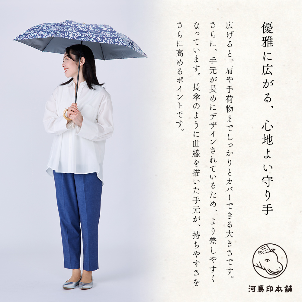「花柄に一目惚れして購入。2段折りは3段より開いた時の形が綺麗で、開閉もスムーズ。持ち手のJ型も使いやすく満足です。」