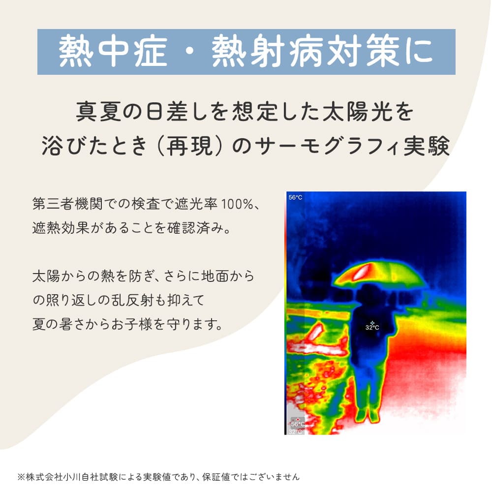 遮光率100%、UVカット率99.9%以上の高い遮熱性を誇り、夏の強い日差しからお子さまの肌をしっかりガード。撥水加工も施されているので、突然の雨にも対応可能。晴れの日も、雨の日も、安心して持たせてあげられます。