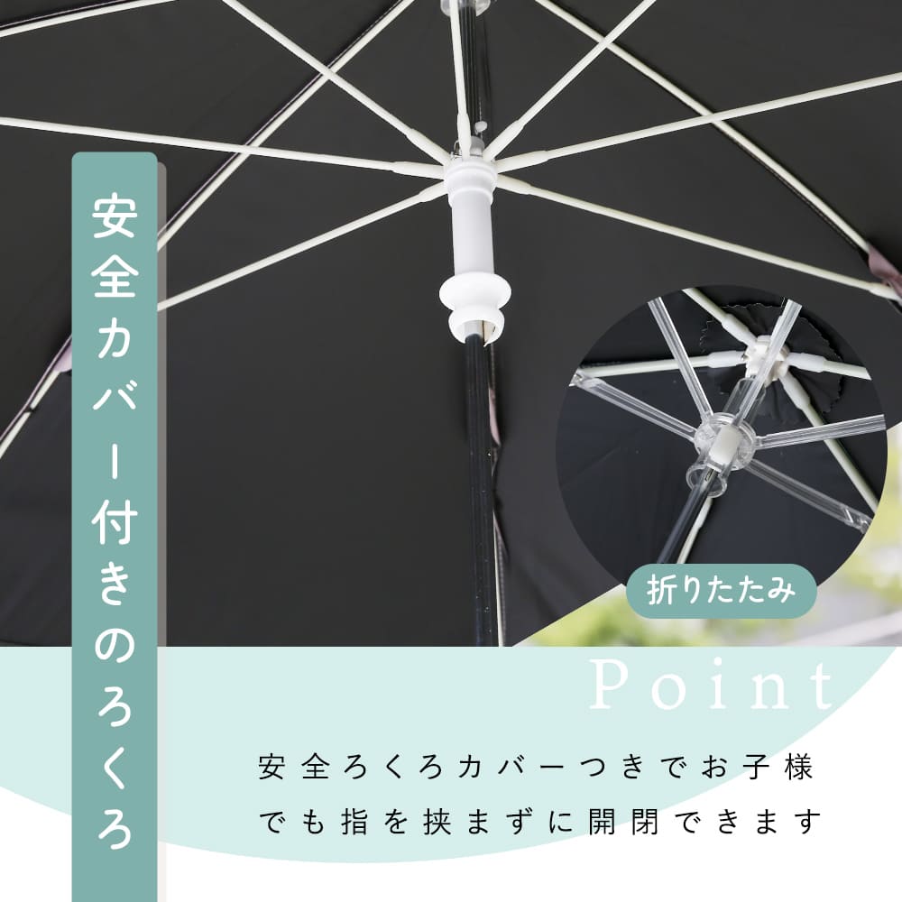 軽量な手開き式を採用し、指を挟みにくい安全設計。初めての傘でも扱いやすく、通園や通学、お出かけ先でもスムーズに使用できます。親骨55cm、直径約93cmでしっかり日差しをカバーします。