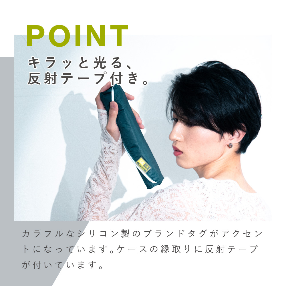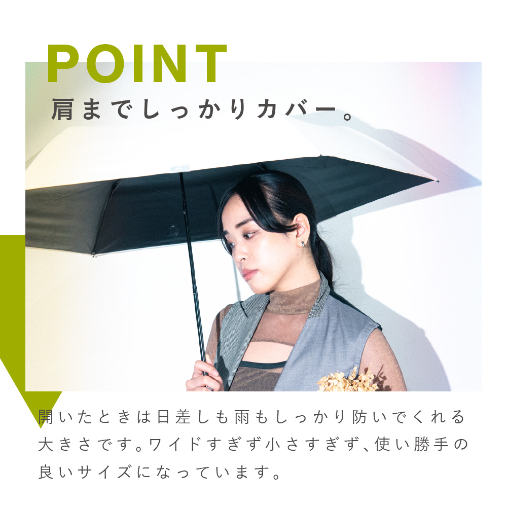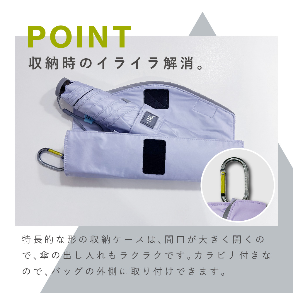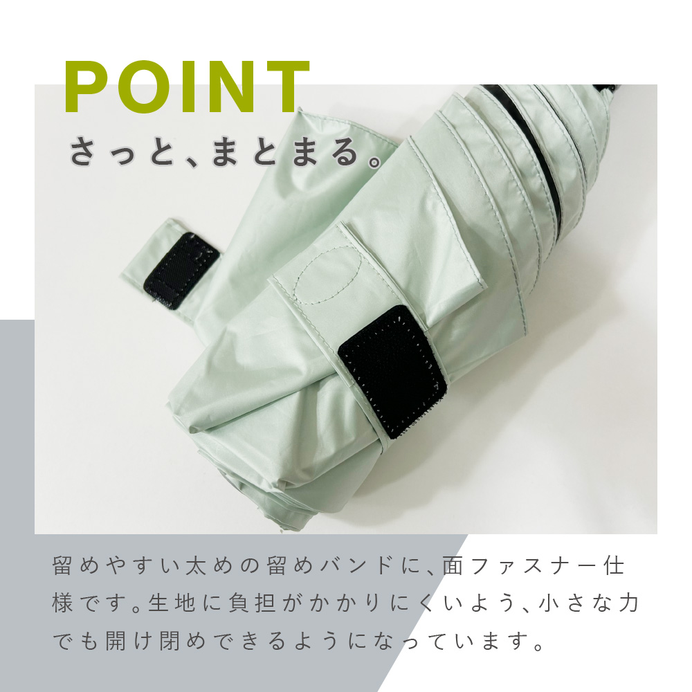 バッグに入れてもかさばらない、軽量折りたたみ日傘です。500mlペットボトルよりも軽く、しかも細いため、毎日持ち歩いても負担が少ないのがポイント。共袋の間口が大きく開くので、傘の出し入れもスムーズです。