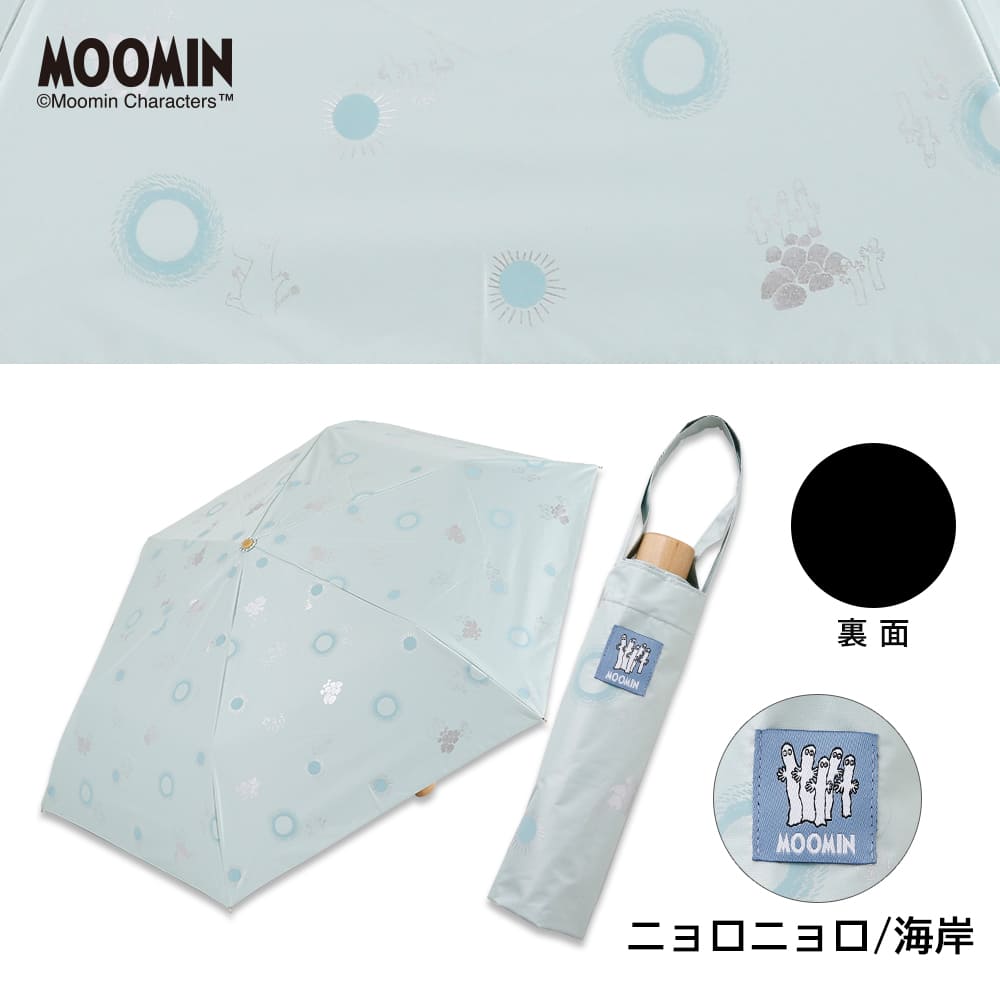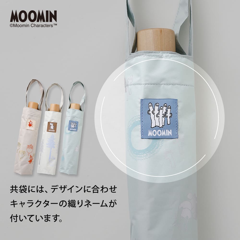 繊細なタッチで描かれたムーミンのアートと、やさしい色合いが魅力の晴雨兼用折りたたみ傘。