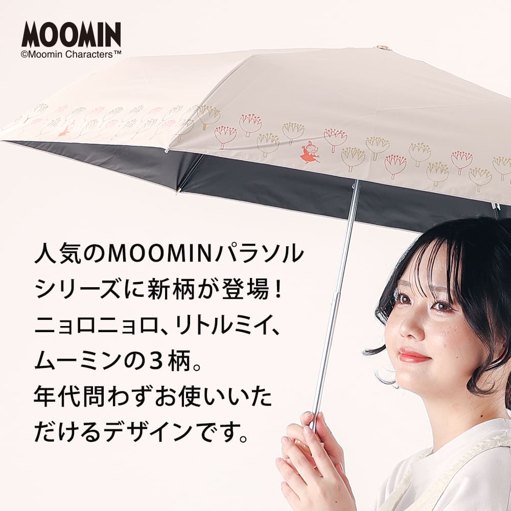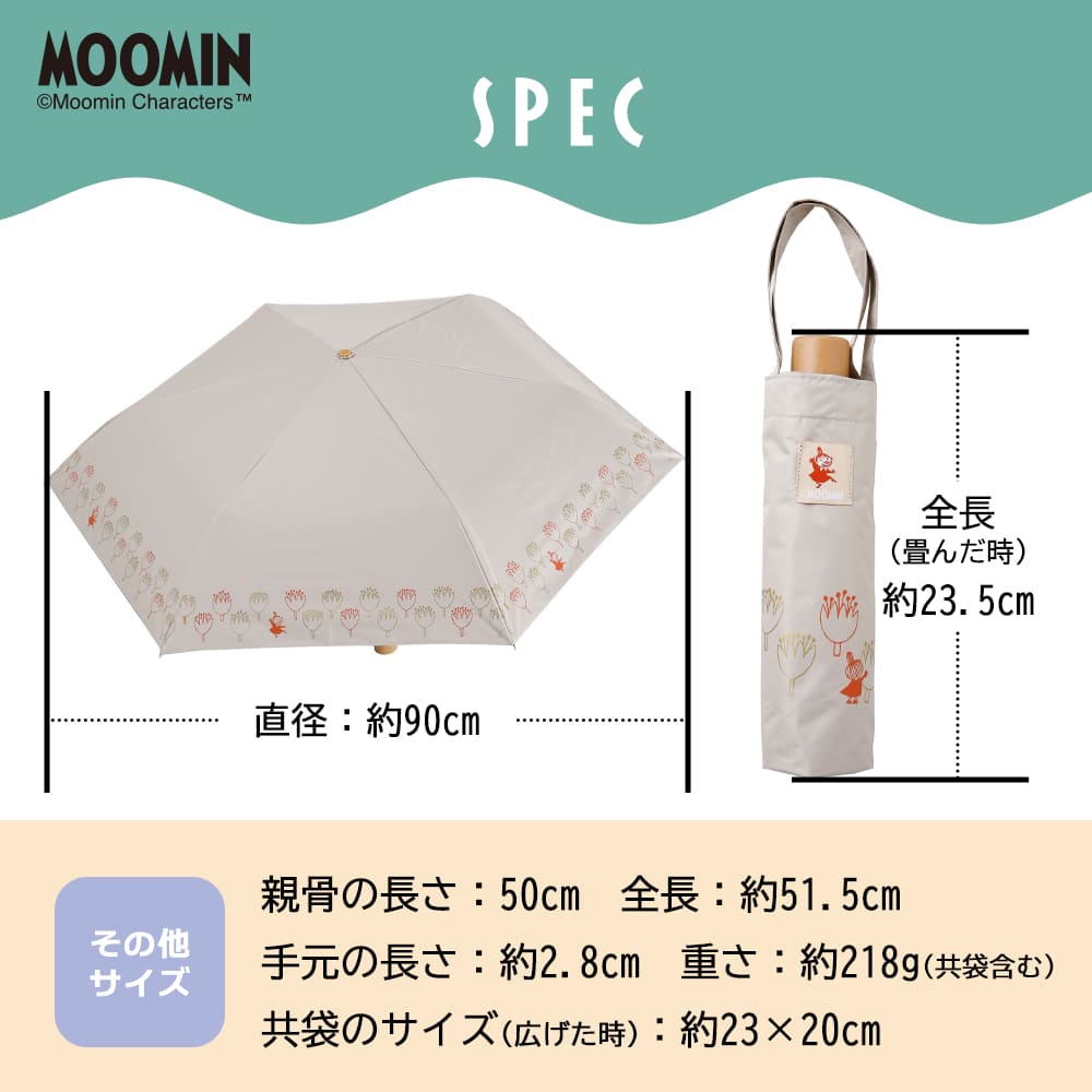 繊細なタッチで描かれたムーミンのアートと、やさしい色合いが魅力の晴雨兼用折りたたみ傘。大人の女性が日常使いしやすい、落ち着いたトーンで仕上げました。生地にはUVカット率99%以上・遮光率99%以上・遮熱効果のあるポリエステル100%素材を使用し、裏面にはポリウレタンコーティングを施しています。