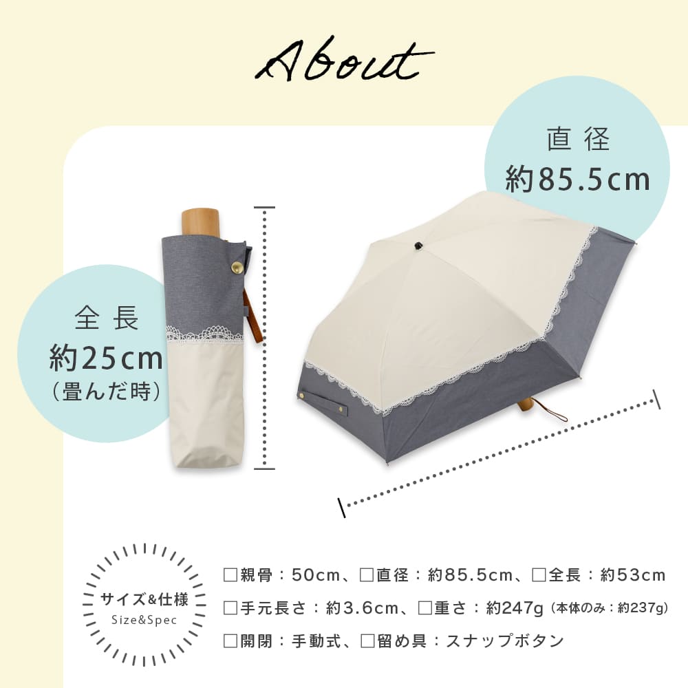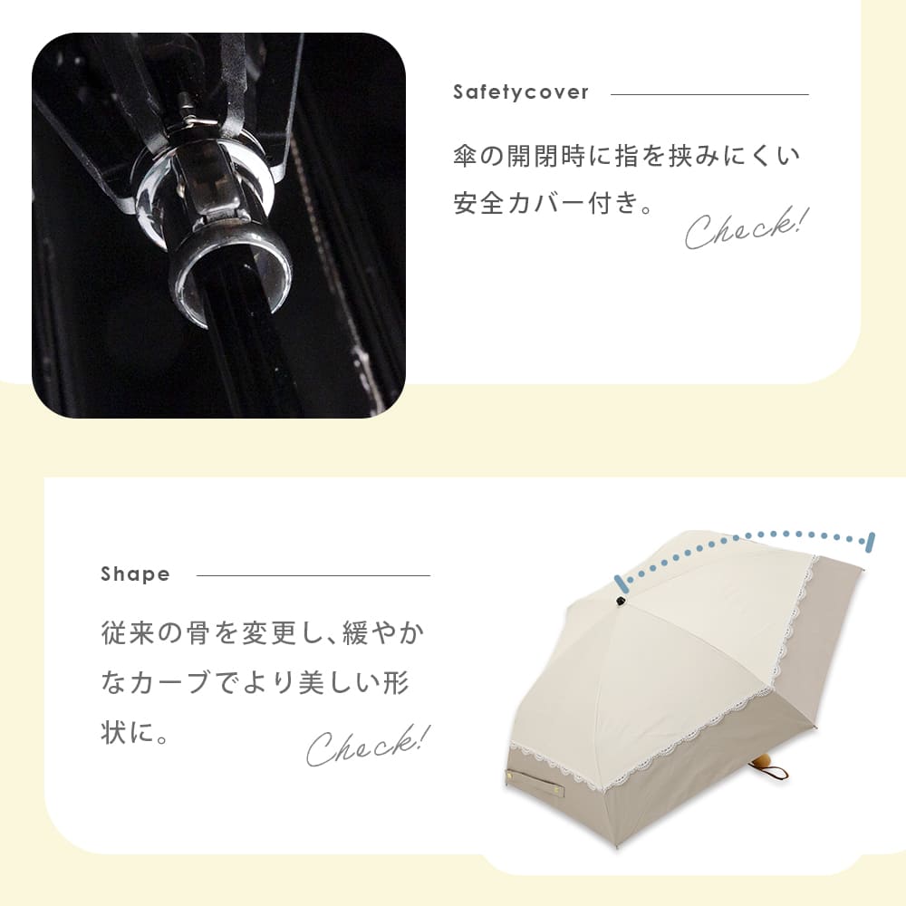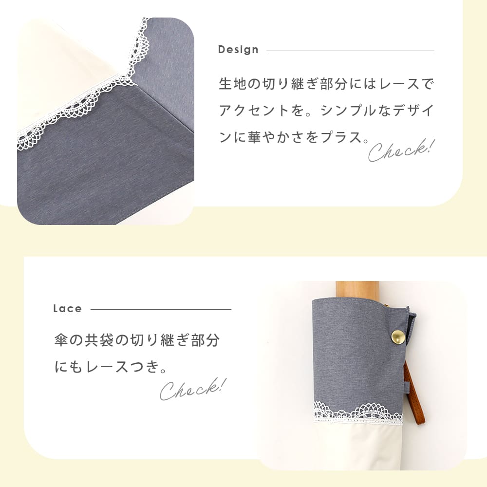 上品なバイカラーの切り継ぎデザインが特徴の晴雨兼用3段折りたたみ日傘です。切り継ぎ部分には繊細なレースがあしらわれ、シンプルでありながら華やかさを添え、女性らしさを引き立てます。手元や留め具には高見えするゴールドパーツをあしらい、洗練された印象を演出します。3段折りたたみタイプでバッグにも収まりやすく、持ち運びに便利なコンパクト設計です。