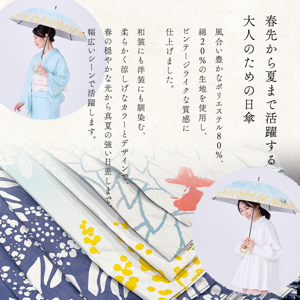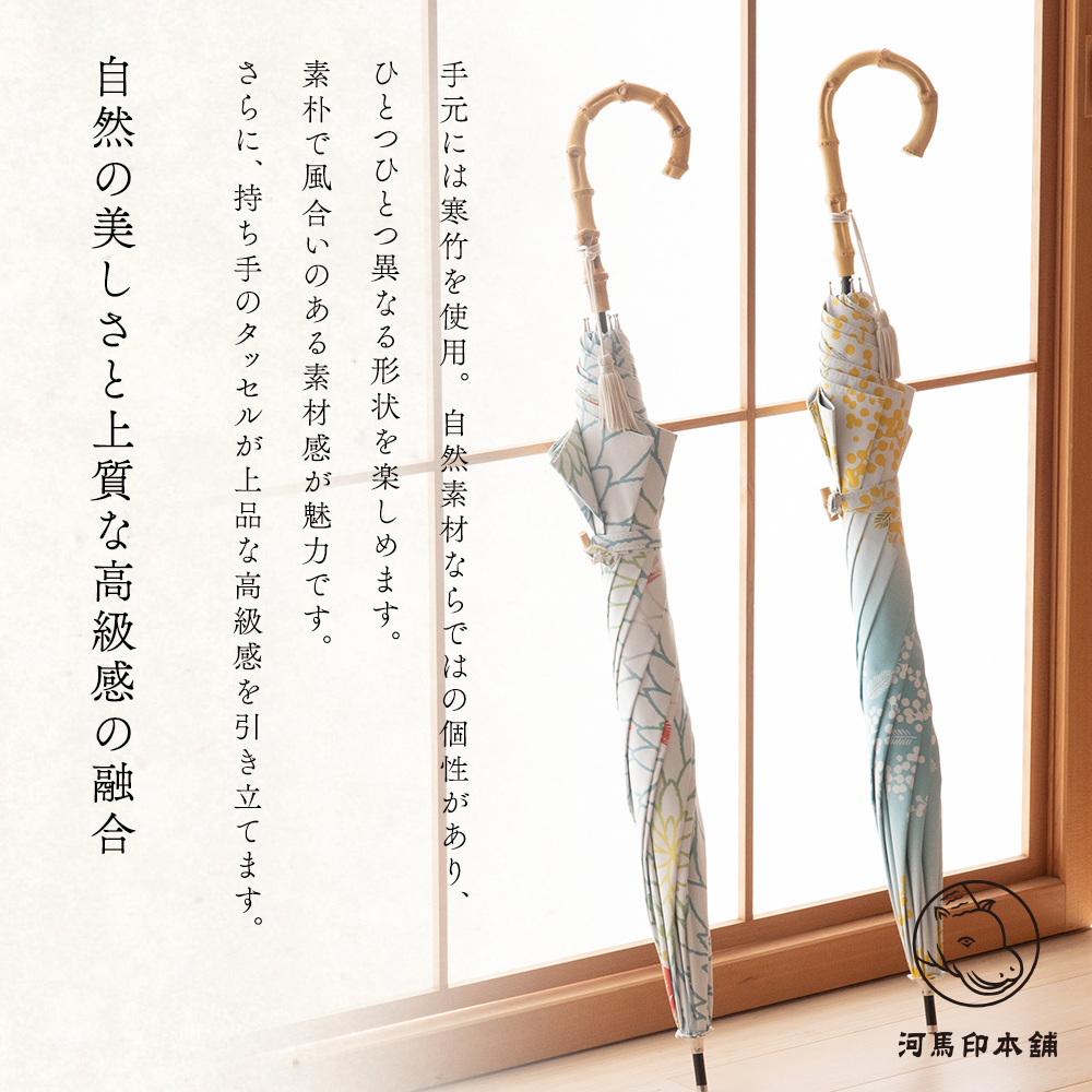 急な雨にも対応可能な晴雨兼用日傘です。ポリエステル80%・綿20%の風合いのある生地を使用しています。寒竹の手元にタッセルが付いており、上品な和のテイストが感じられます。日傘としては一般的なサイズの長傘です。デザインによって裏面のコーティング色が違います。