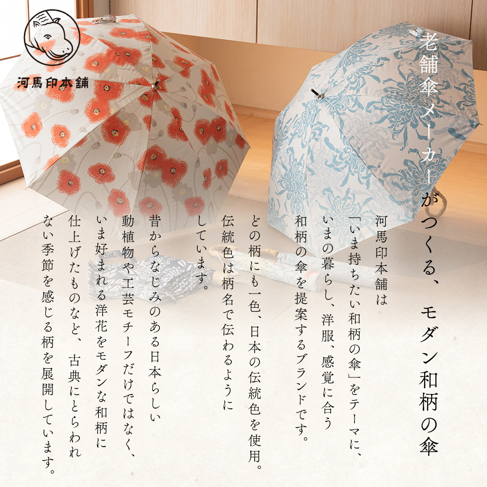 「カバ印の傘カバー」から始まり80年。会社設立から一貫して傘を製造してきた傘の小川が、今までもこれからも愛され続いていくような伝統と現代を繋ぐ和柄の傘を作りました。伝統的な和柄を参考に現代的にアレンジし描き起こしたもの、伝統的な染めの雰囲気をプリントで再現したもの、シンプルでモダンに見える和柄など、和装はもちろん洋服にも合わせやすい柄をラインナップ。さらにすべてのデザインに日本の伝統色が1色用いられています。
