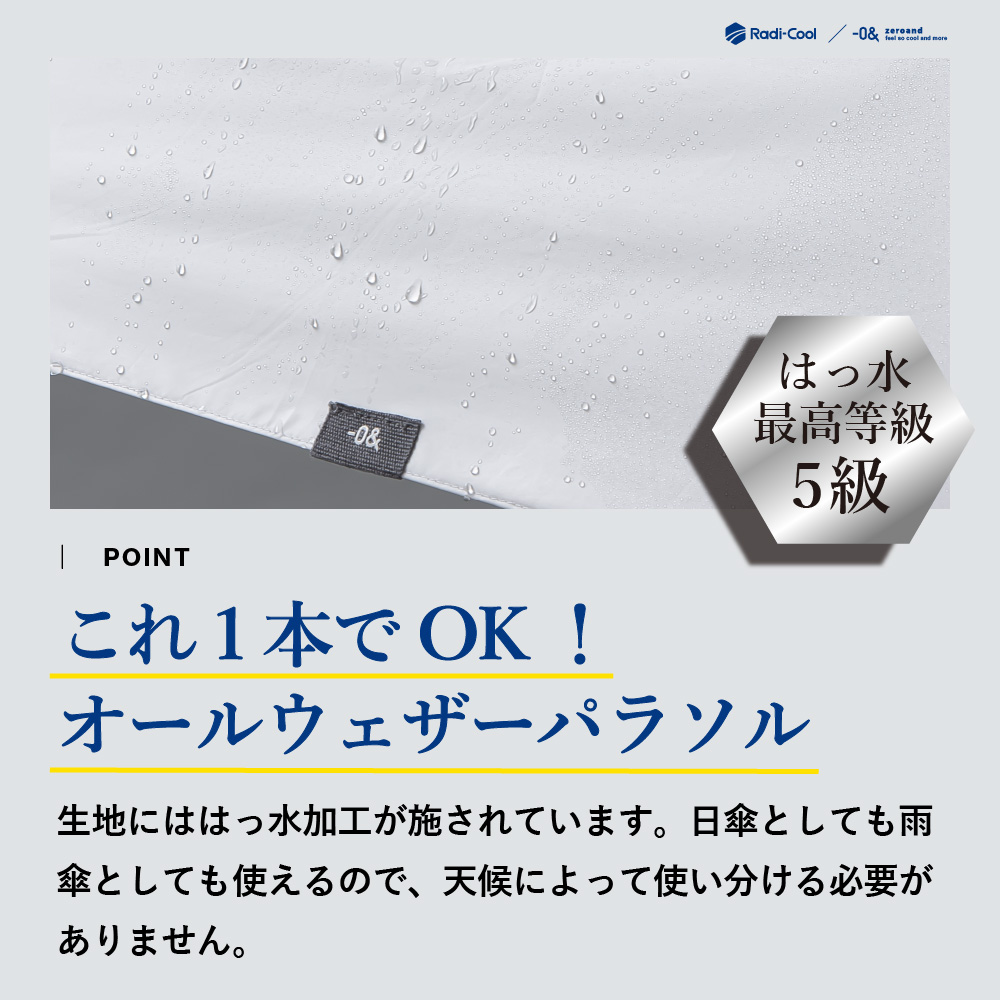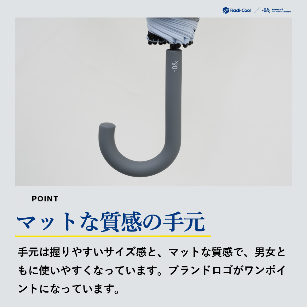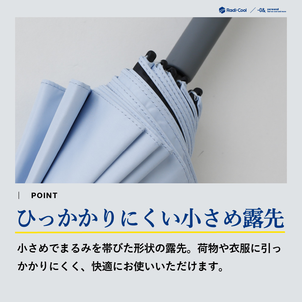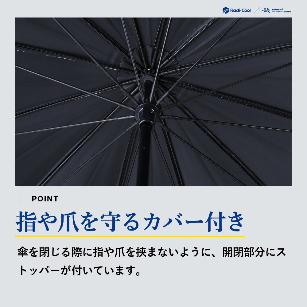 放射冷却技術を採用し、受けた熱を反射しながら効率的に放熱。傘の下はまるで木陰のような涼しさを実現します。UVカット・遮光機能を備え、強い日差しをしっかりガードする高機能晴雨兼用日傘です。