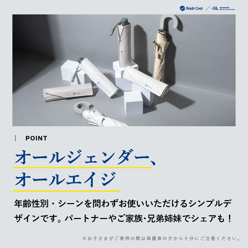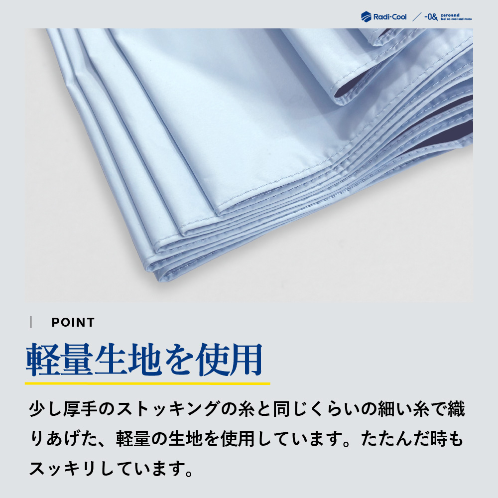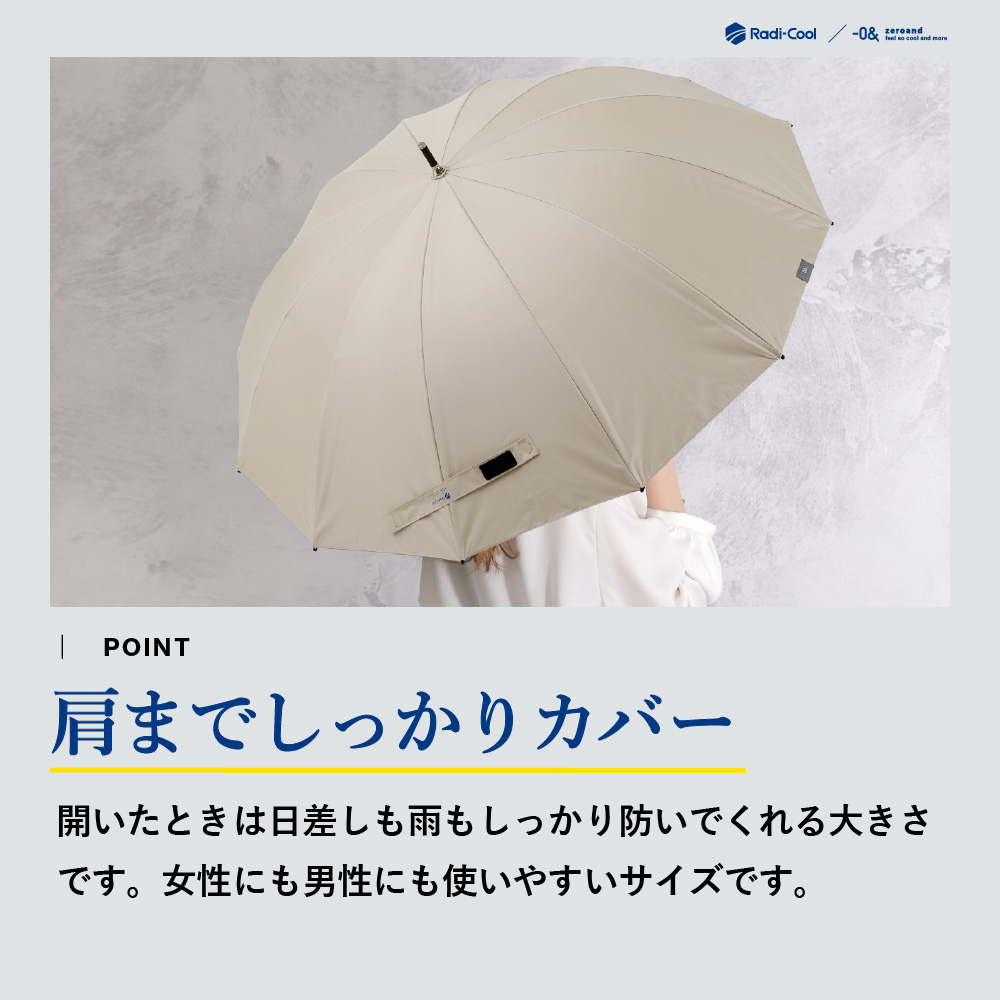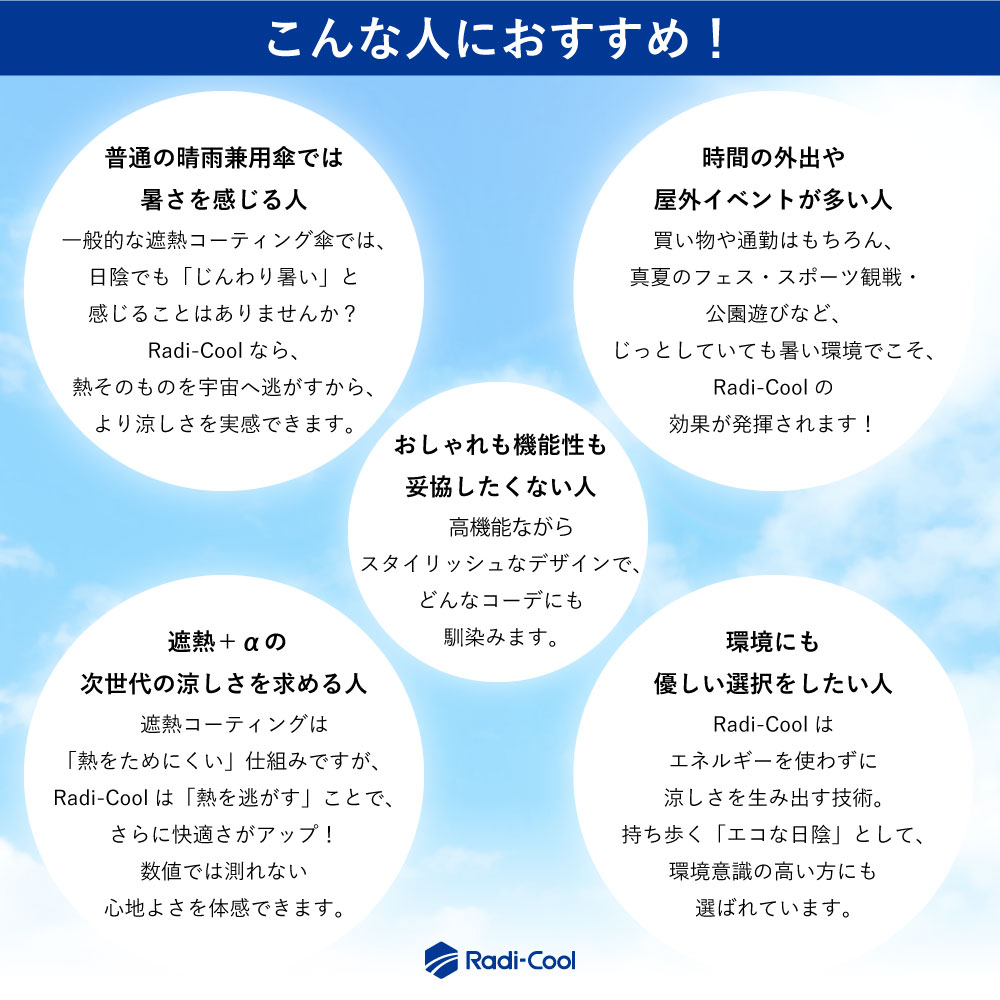 放射冷却技術を採用し、受けた熱を反射しながら効率的に放熱。傘の下はまるで木陰のような涼しさを実現します。UVカット・遮光機能を備え、強い日差しをしっかりガードする高機能晴雨兼用日傘です。