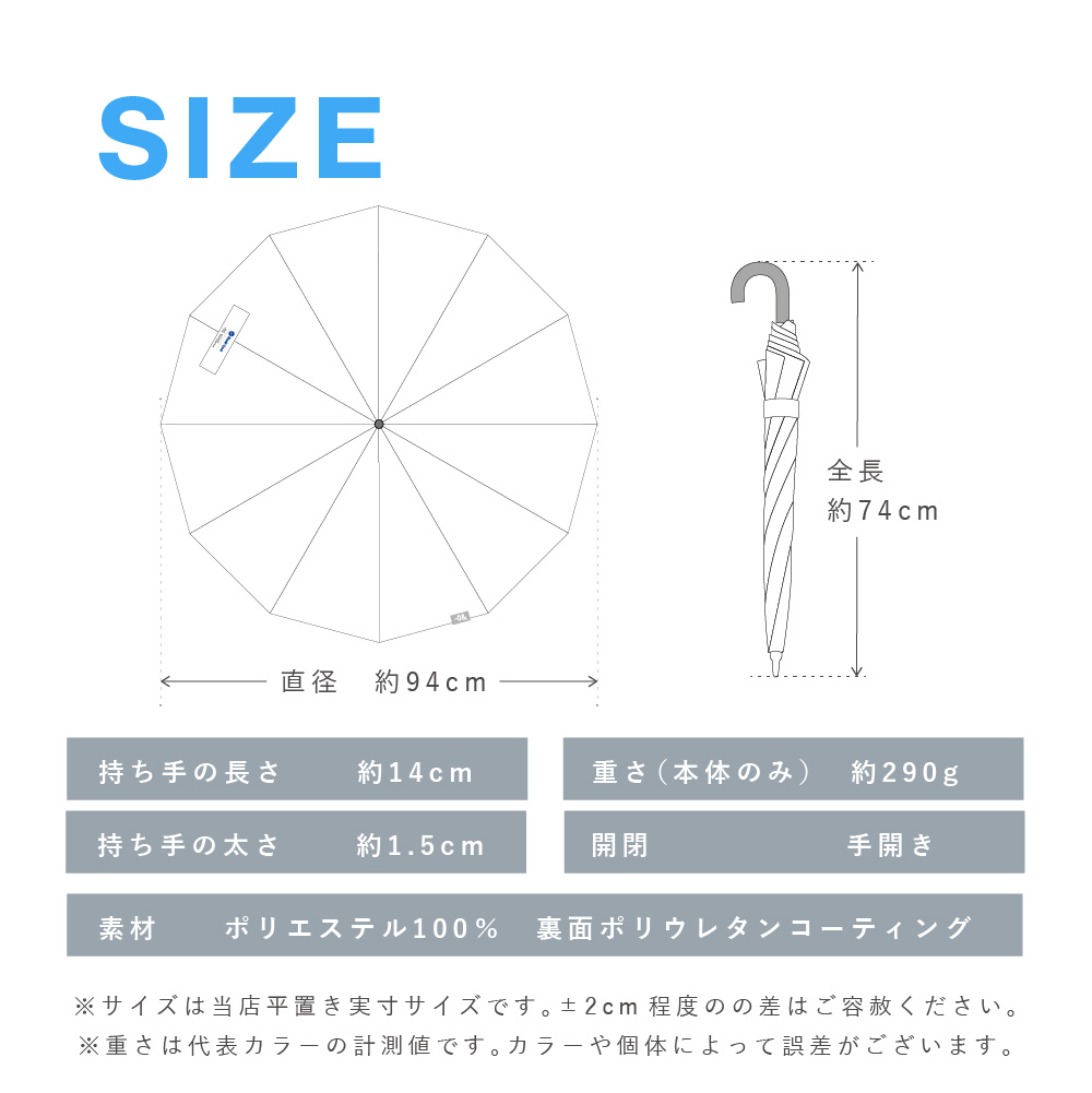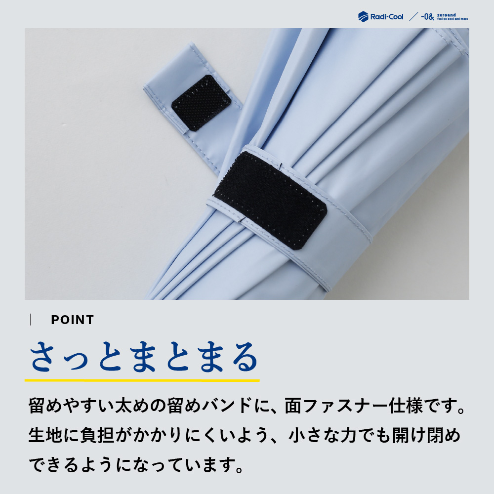 晴雨兼用仕様で、日差し対策にも急な雨にも対応。手開き式で扱いやすく、留め具は面ファスナー仕様。しっかりとしたサイズ感で体を広くカバーします。