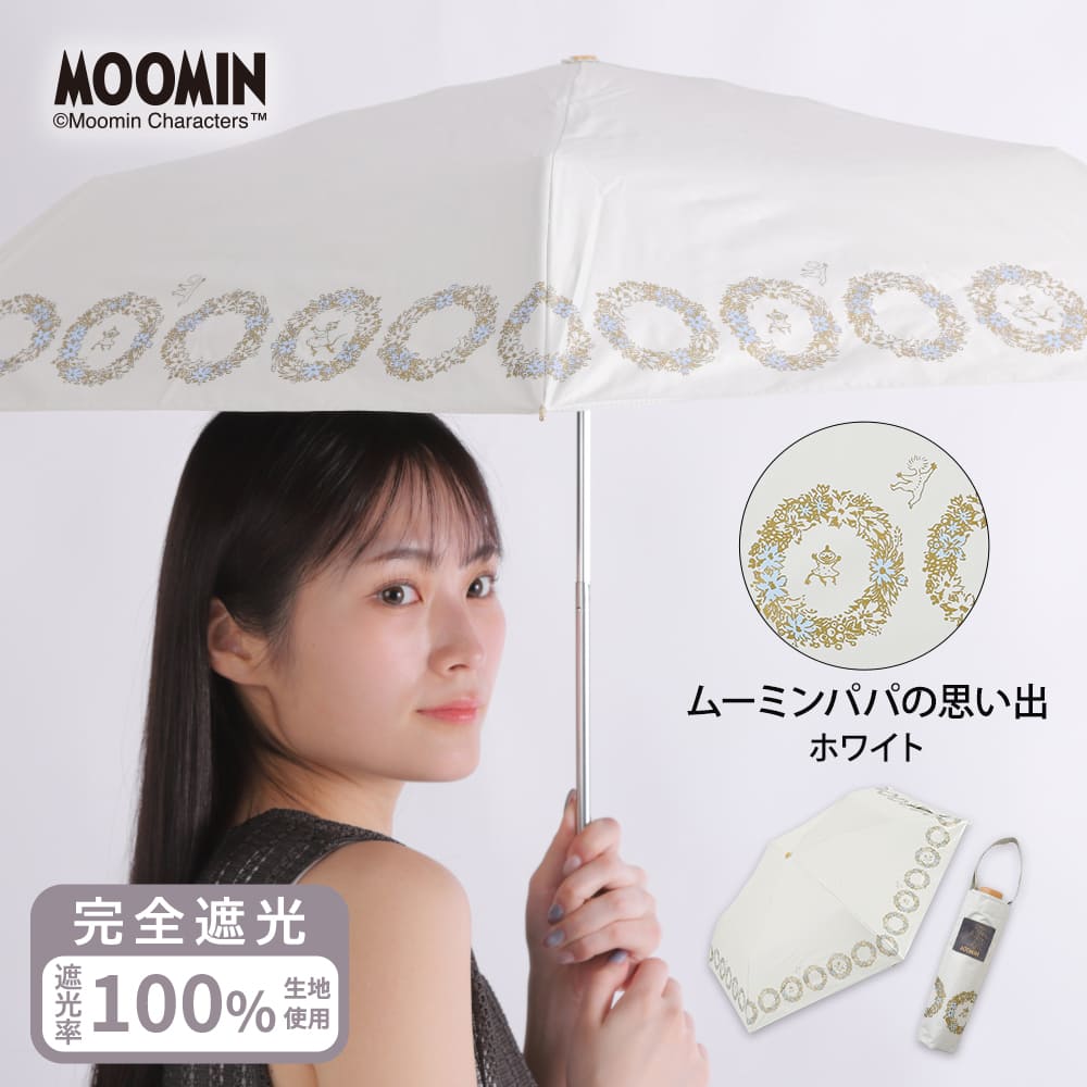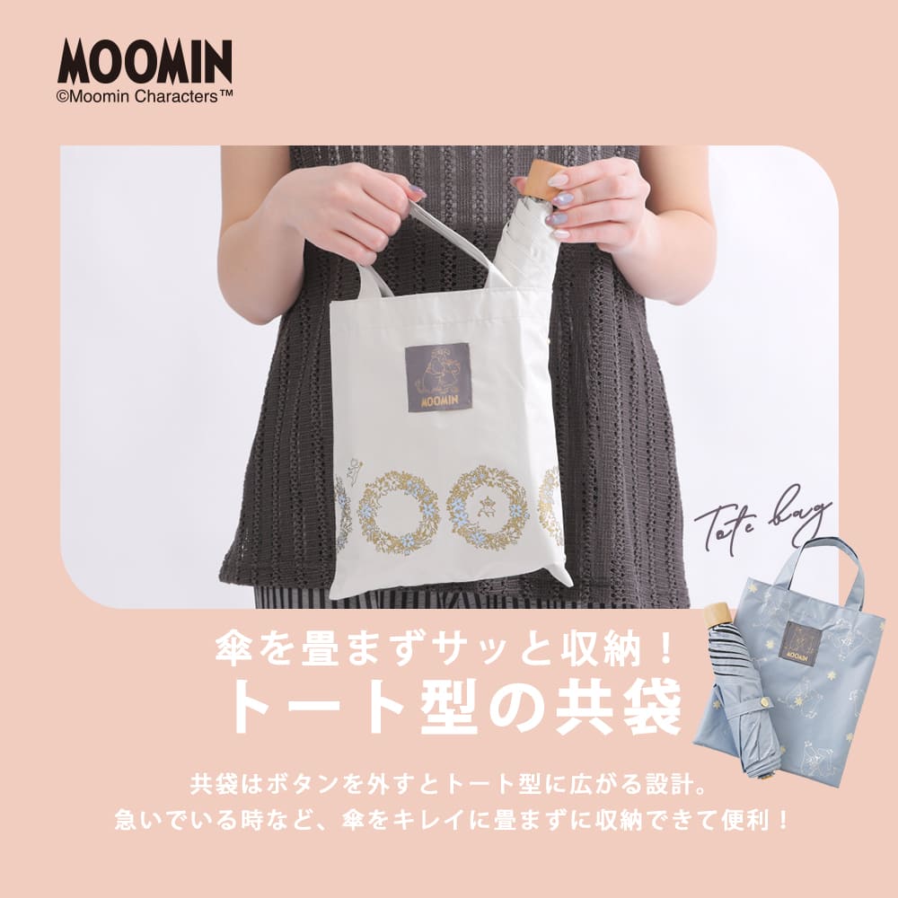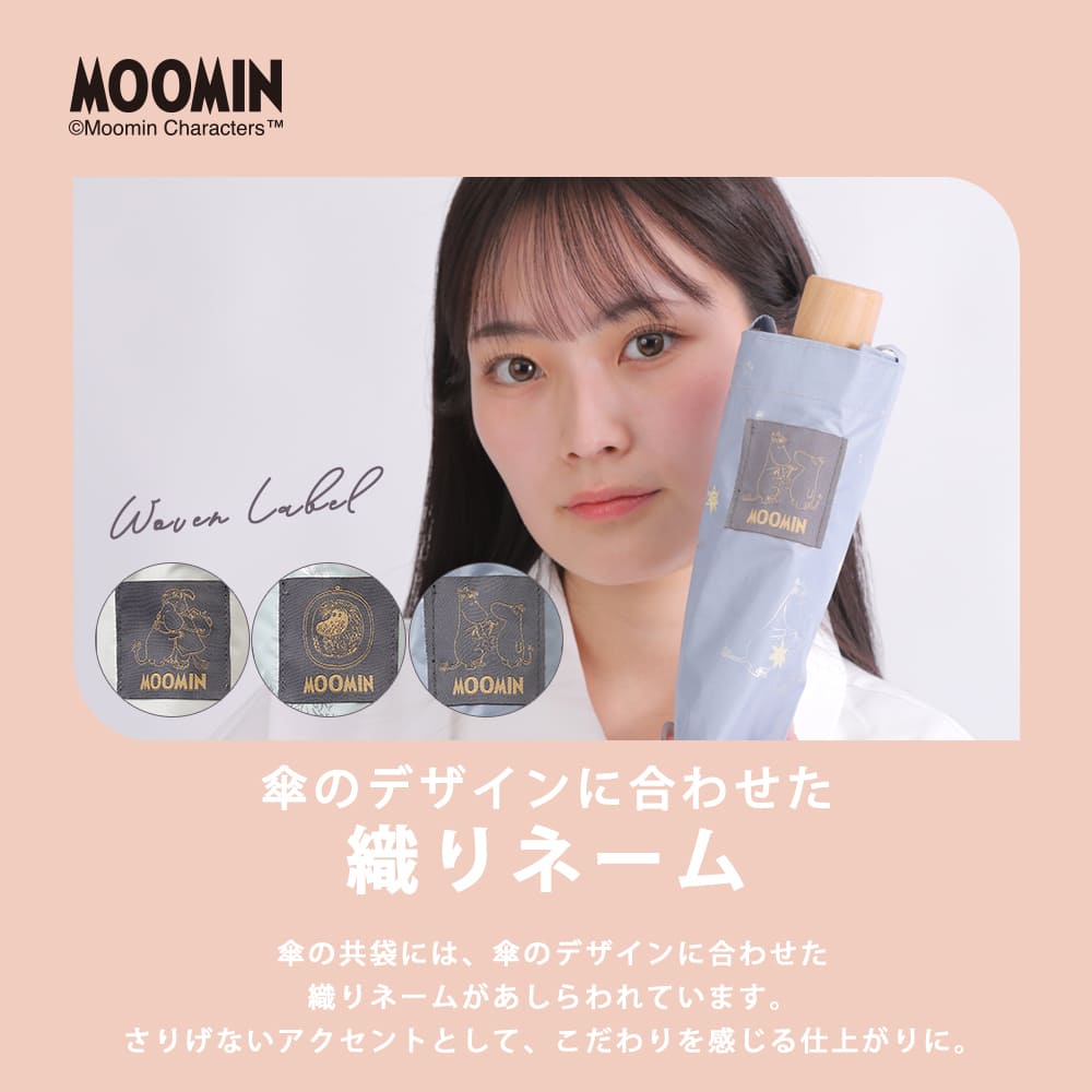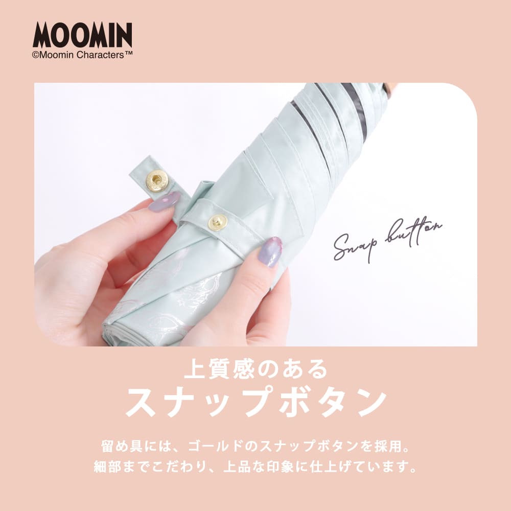 繊細なタッチで描かれたムーミンのアートと、やさしい色合いが魅力の晴雨兼用折りたたみ傘。日常使いしやすい、落ち着いたトーンで仕上げました。生地にはUVカット率99%以上・遮光率99%以上・遮熱効果のあるポリエステル100%素材を使用し、裏面にはポリウレタンコーティングを施しています。