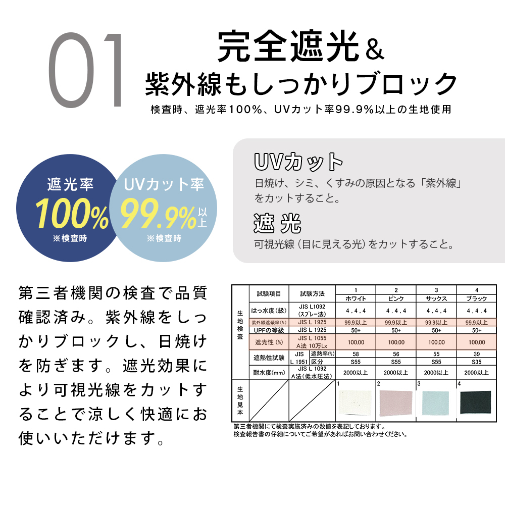 晴雨兼用、UVカット99.9%以上、遮光率100%(完全遮光)、1級遮光、はっ水加工、遮熱効果、UPF50+