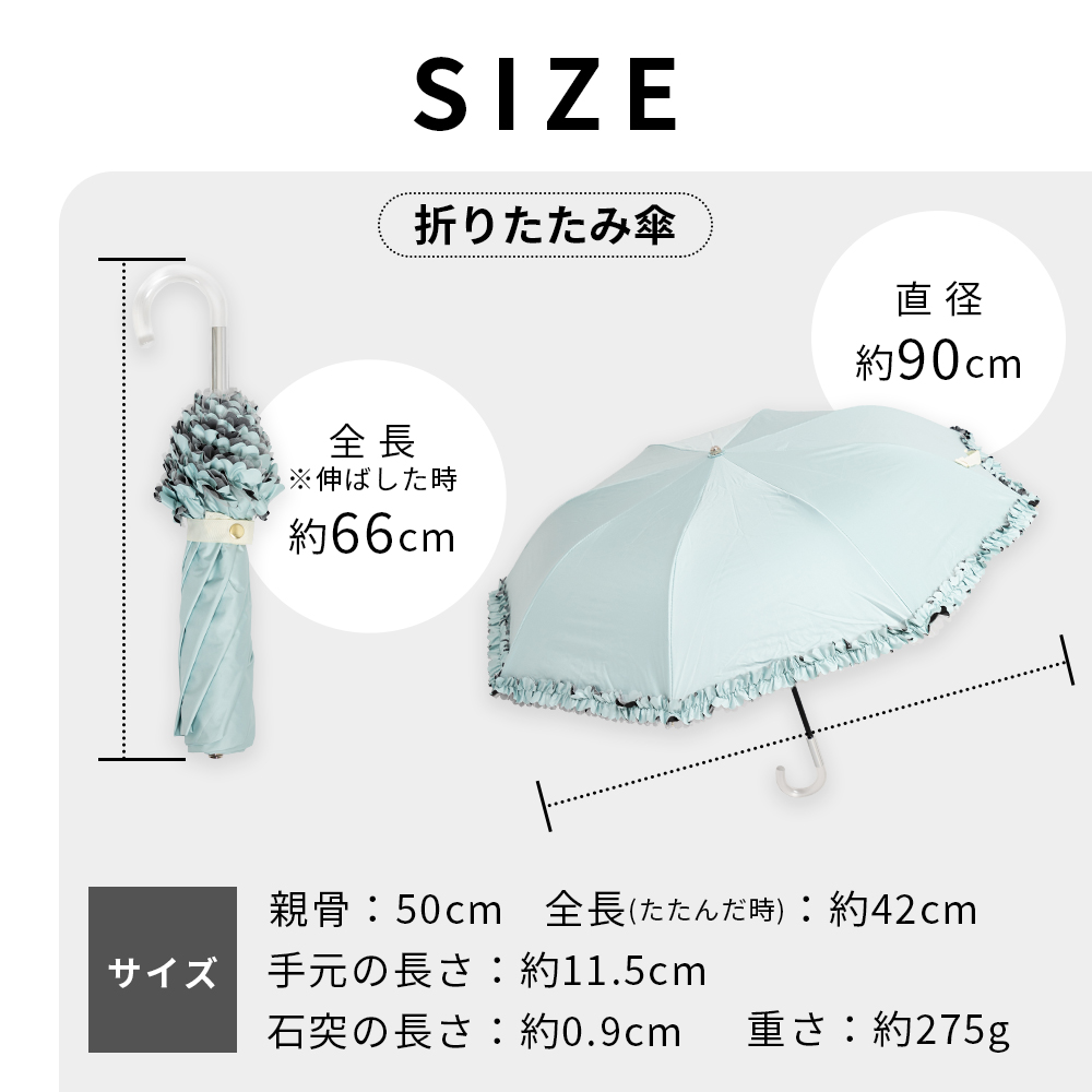 親骨50cmの程よいサイズ感は、広げたときにしっかりカバーし、通勤・通学やお出かけなど日常のさまざまなシーンで活躍します。カラーはミルキーホワイト、パウダーアクア、シェルピンク、ブラックダイヤモンドの4色展開。シンプルな無地生地にフリルとチュールの重なりが上品な華やかさを添え、ギフトやプレゼントにもおすすめの一本です。