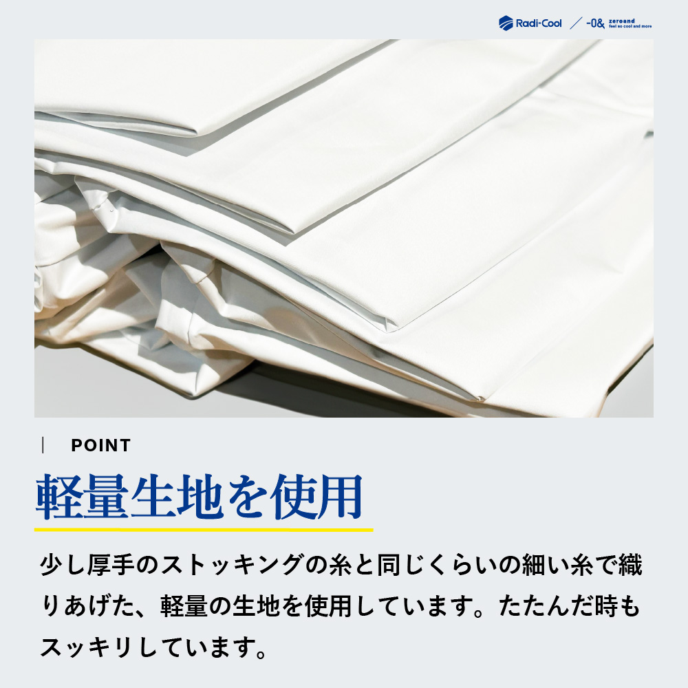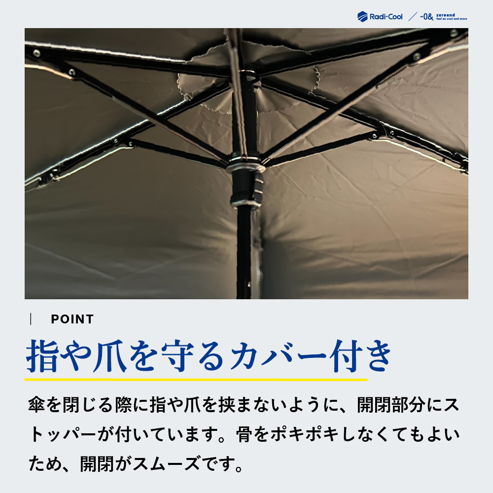 放射冷却技術を採用したRadi-Cool日傘。受ける熱を反射しながら効率よく放熱し、傘の下はまるで木陰のような涼しさを実現します。UVカット率・遮光率ともに100%で、強い日差しからしっかり守ります。
