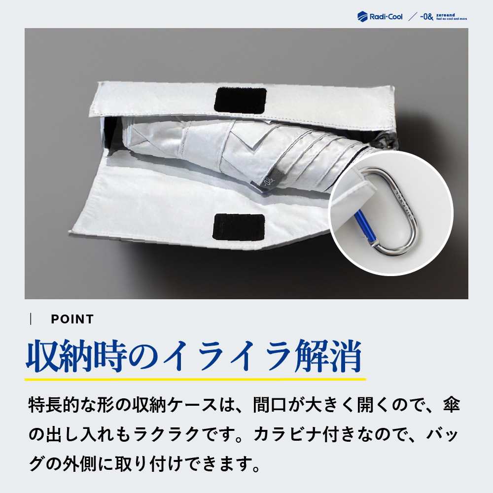 炎天下でも傘表面に熱がこもりにくく、内側への熱伝導を軽減。当社従来品と比較して最大値の遮熱効果を発揮します。電力を使わない冷却効果のため、環境にも配慮。軽量で細身の折りたたみ仕様なので、バッグに入れてもかさばらず、雨の日にも使える晴雨兼用設計です。
