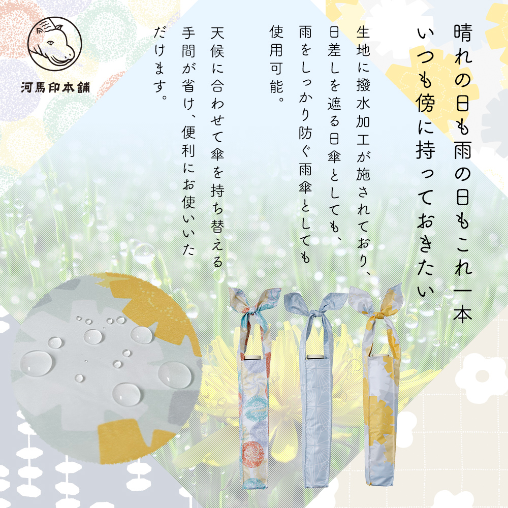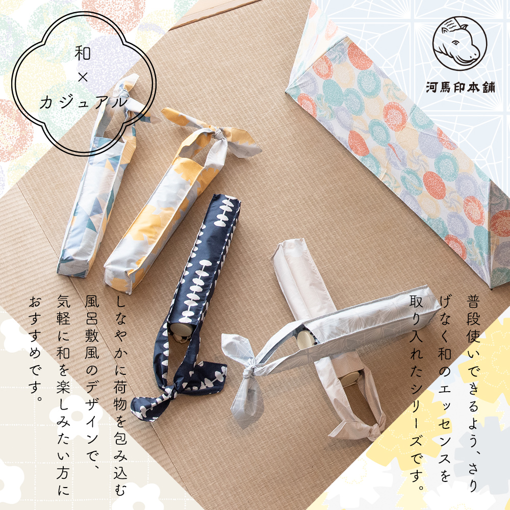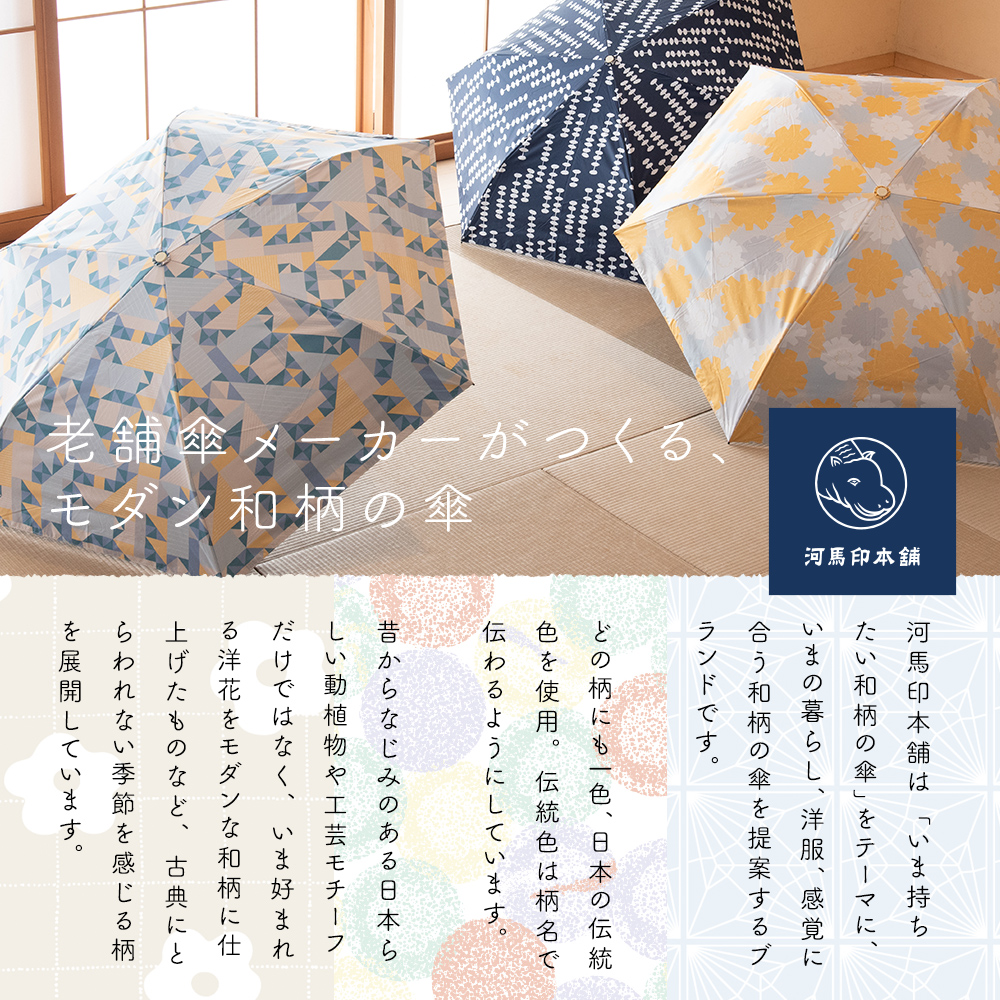 「和」のエッセンスを楽しむ傘 バッグの隙間にもスッキリ入る、スリムな折りたたみ日傘です。風呂敷をイメージした収納袋の結び目を解けば、バッグの持ち手に取り付けることができます。雨でも使える晴雨兼用タイプなので天気によって傘を持ち変える必要がありません。気軽に和を楽しみたい方におすすめです。 【サイズ】 伝統と現代を繋ぐ和柄の傘 【河馬印本舗】 「カバ印の傘カバー」から始まり80年。会社設立から一貫して傘を製造してきた傘の小川が、今までもこれからも愛され続いていくような伝統と現代を繋ぐ和柄の傘を作りました。伝統的な和柄を参考に現代的にアレンジし描き起こしたもの、伝統的な染めの雰囲気をプリントで再現したもの、シンプルでモダンに見える和柄など、和装はもちろん洋服にも合わせやすい柄をラインナップ。さらにすべてのデザインに日本の伝統色が1色用いられています。 |