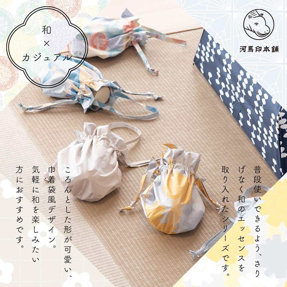 ころんとしたシルエットが可愛い巾着バッグ風の収納袋を備えた、気軽に「和」の雰囲気を楽しめる和モダンなデザインです。