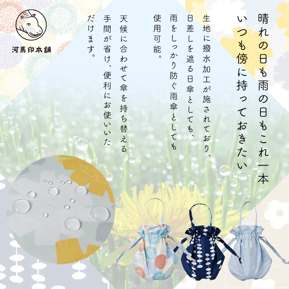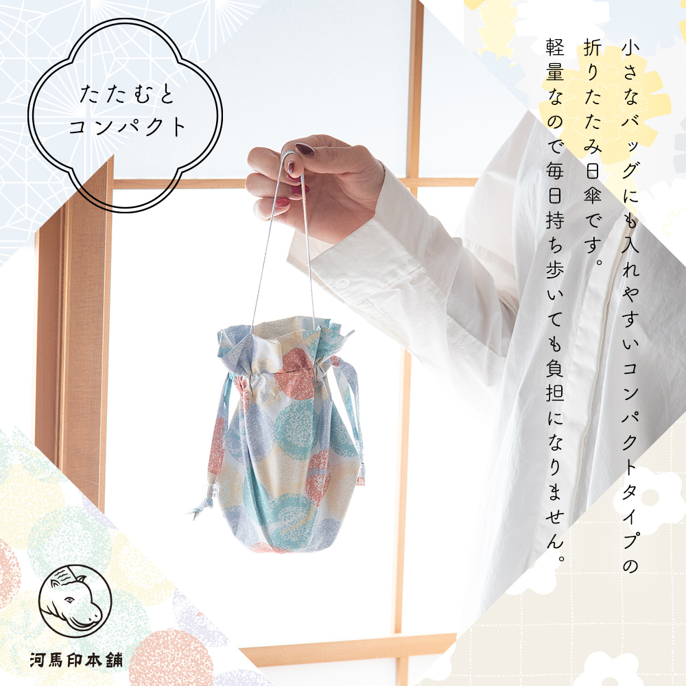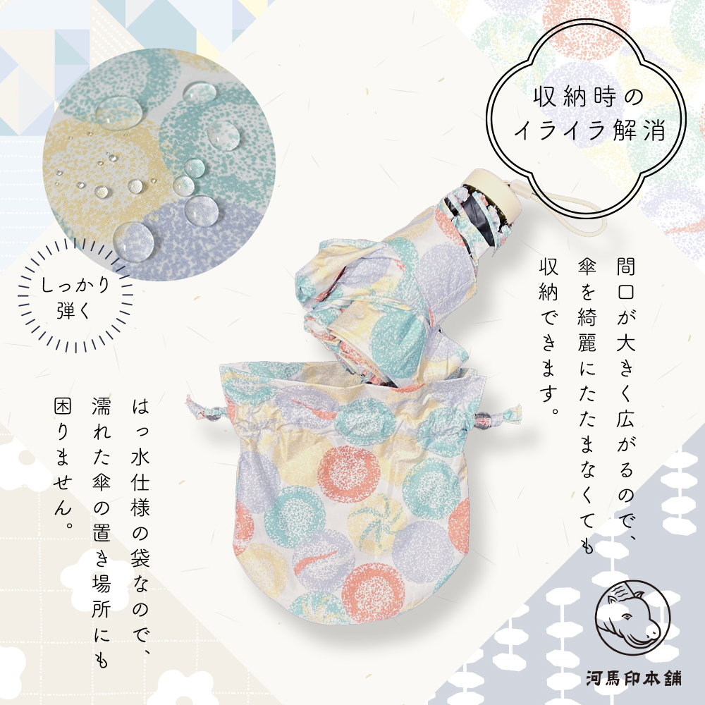 小さめのバッグに入れてもかさ張らないコンパクトな折りたたみ日傘です。ころんとしたシルエットが可愛い巾着バッグ風収納袋は、間口が大きく開くので、傘をきれいにたたまなくても収納できます。雨でも使える晴雨兼用タイプなので天気によって傘を持ち変える必要がありません。気軽に和を楽しみたい方におすすめです。