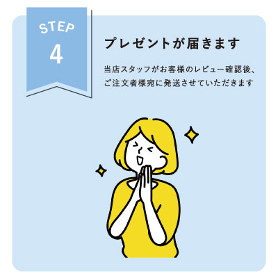 当店スタッフがお客様のレビューを確認後、ご注文者様宛てに発送させていただきます。
